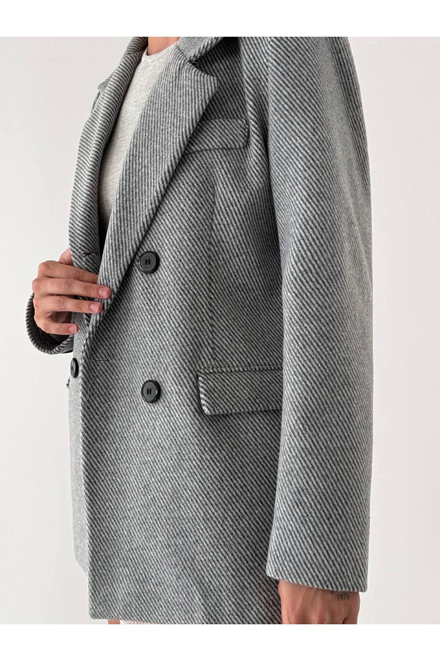 popibutik Balık Sırtı Desenli Astarlı Düğmeli Gri Kaşe Kumaş Kısa Boy Kaban