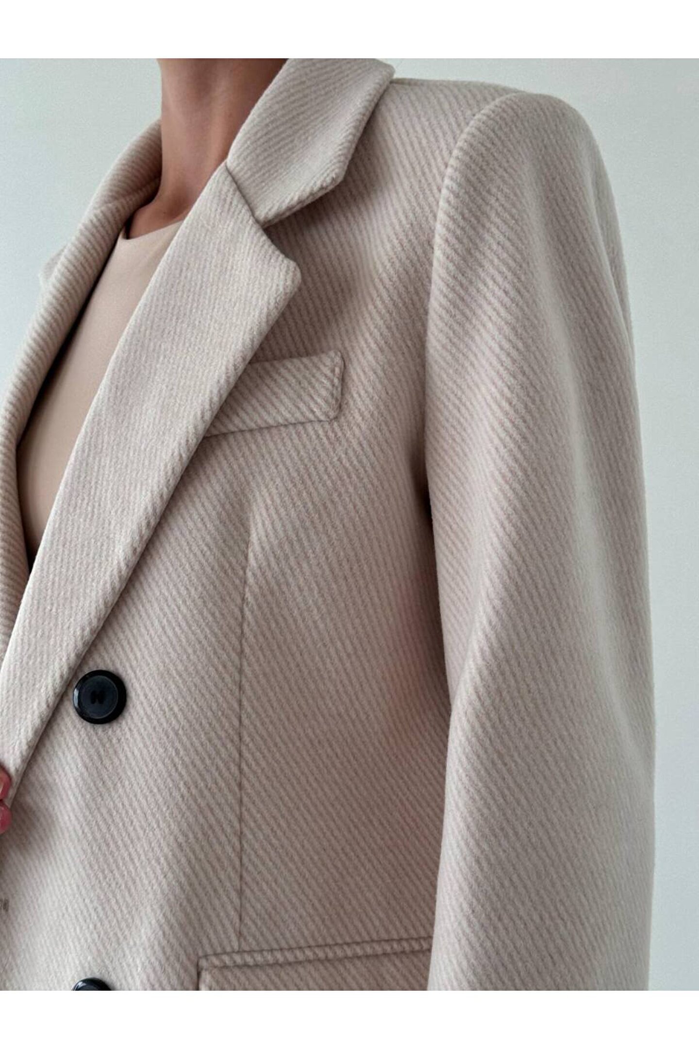 popibutik Balık Sırtı Desenli Astarlı Düğmeli Krem Kaşe Kumaş Kısa Boy Kaban