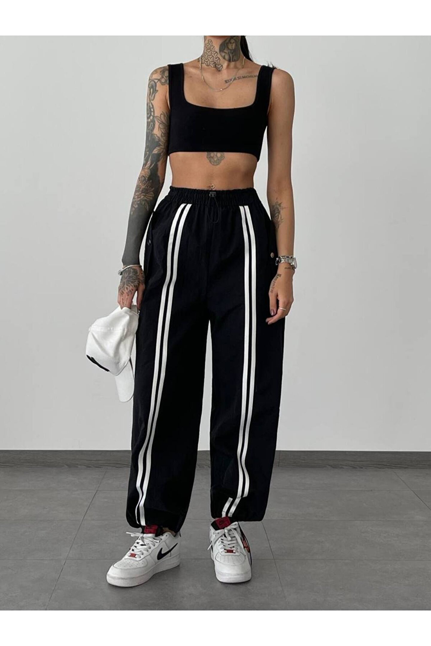 popibutik Cep Detaylı Lastikli Siyah Paraşüt Pantolon