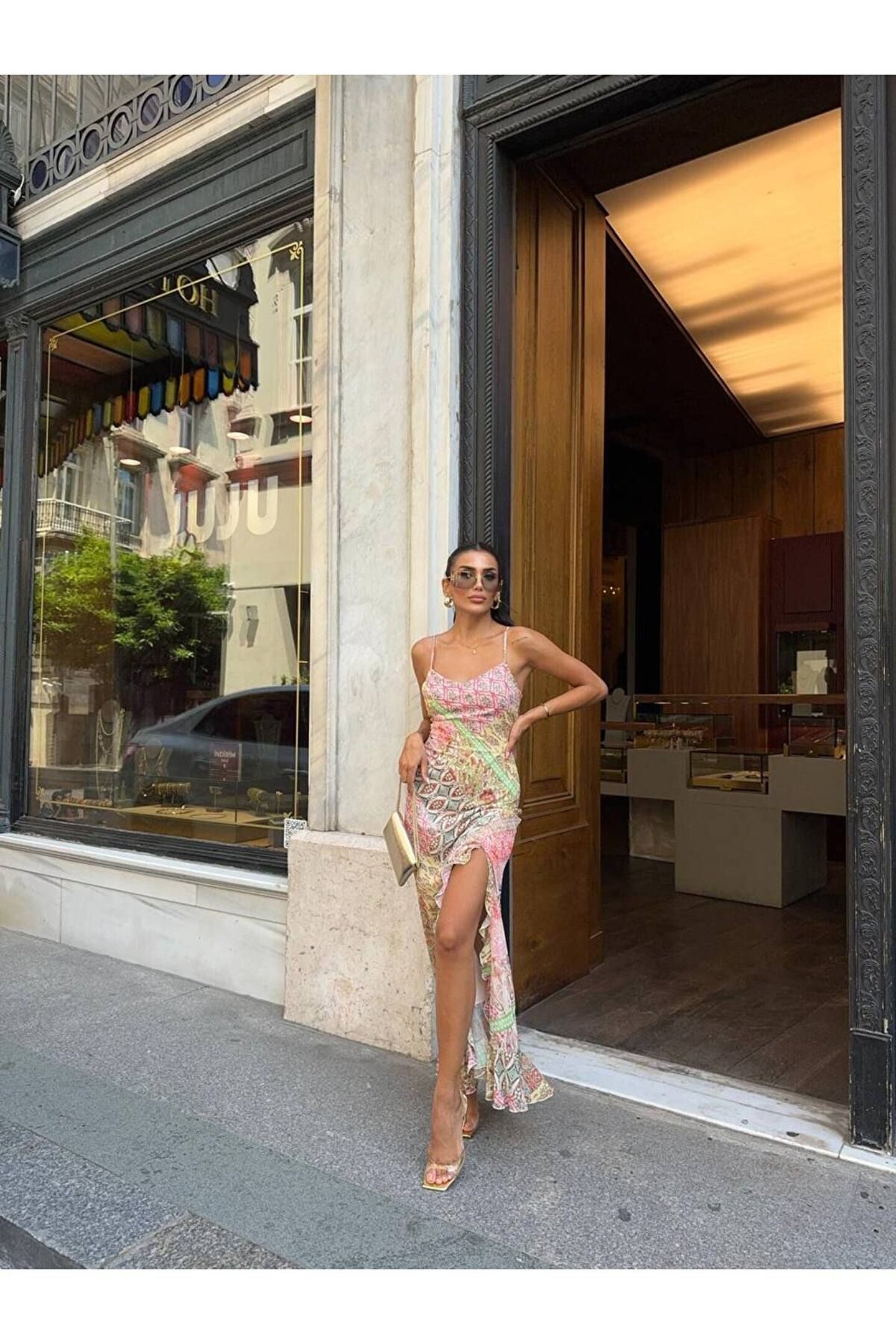 popibutik Desenli İnce Askılı Pembe Uzun Şifon Elbise