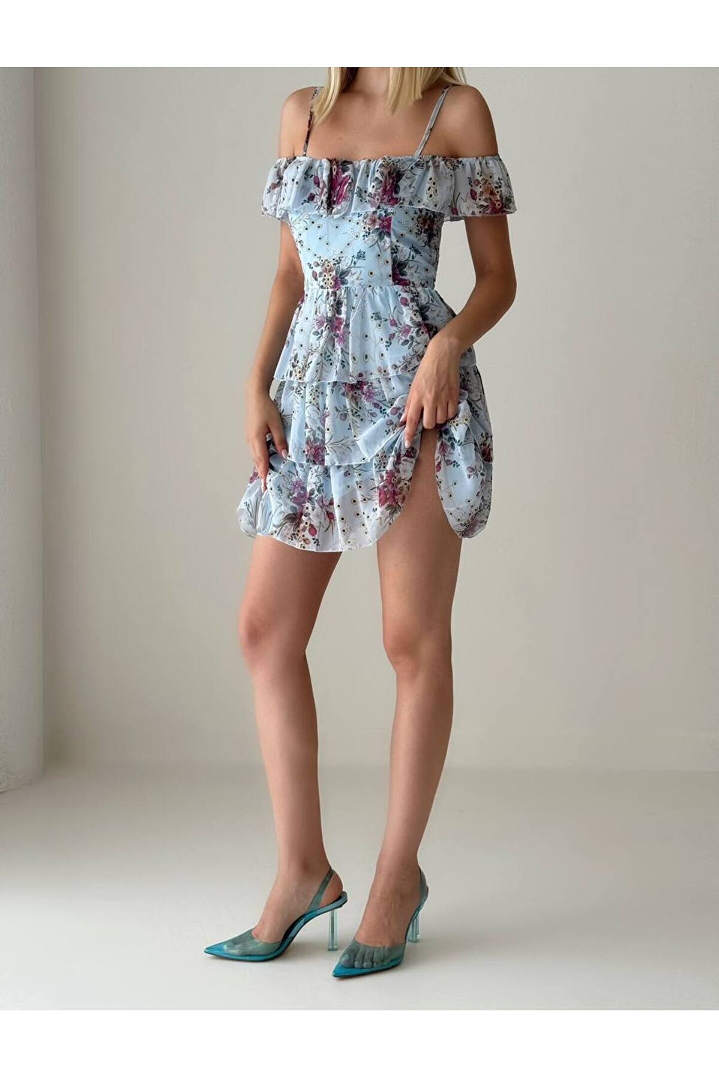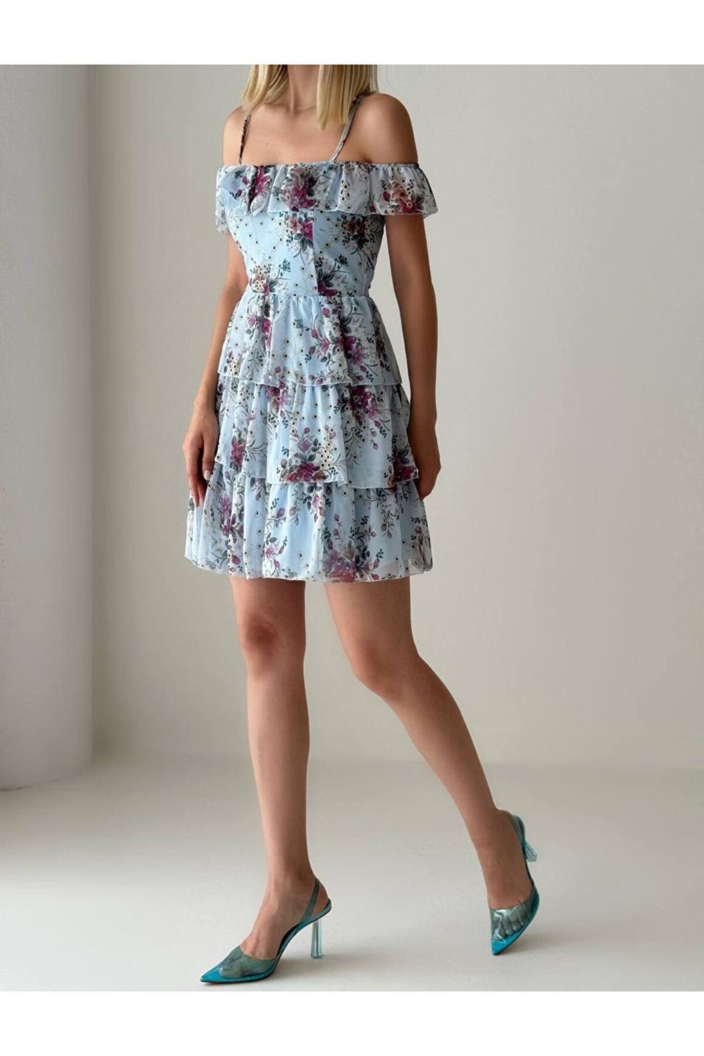 Gençlerin enerjisini ve dinamizmini yansıtan, bebe omuz kat etekli tasarımıyla dikkat çeken mini mavi elbise; Beline oturan kalıbı sayesinde vücut hatlarını zarifçe sararak feminen bir siluet oluşturur; Mini boyu ile modern ve şık bir görünüm sunar, hareket özgürlüğünüzü kısıtlamaz; Şifon kumaş yapısı, hafif ve nefes alabilen dokusuyla gün boyu konfor sağlar; Belirtilmemiş kumaş tipi, esneklik ve rahatlık sunarak her türlü vücut tipine uyum sağlar;