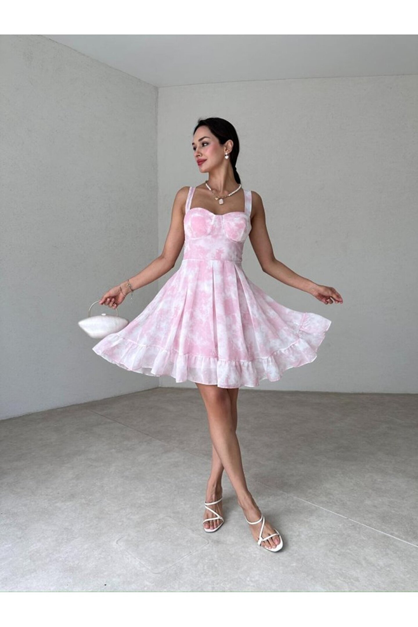 popibutik Gloplu Kalın Askılı Pile Etek Mini Şifon Pembe Elbise