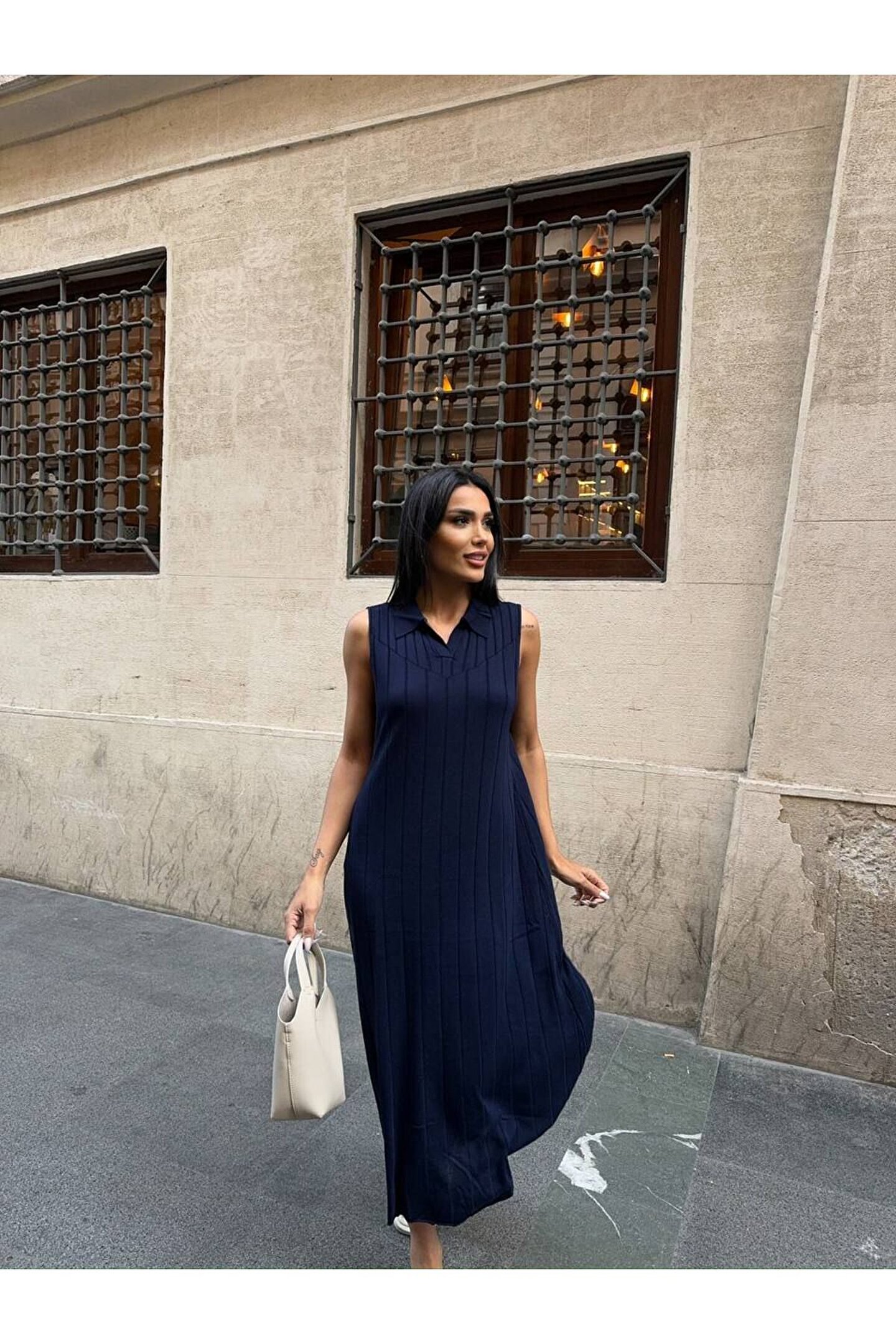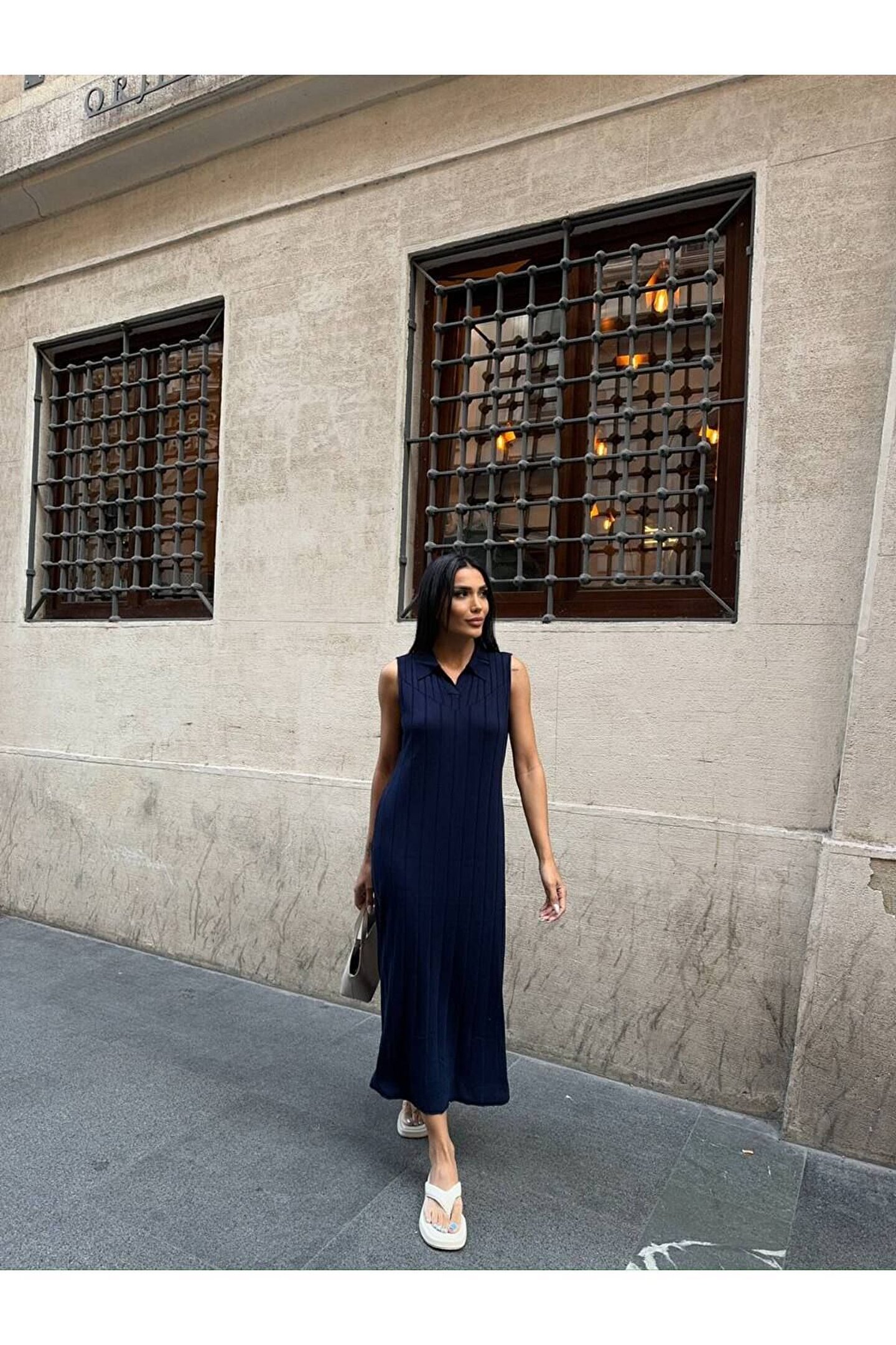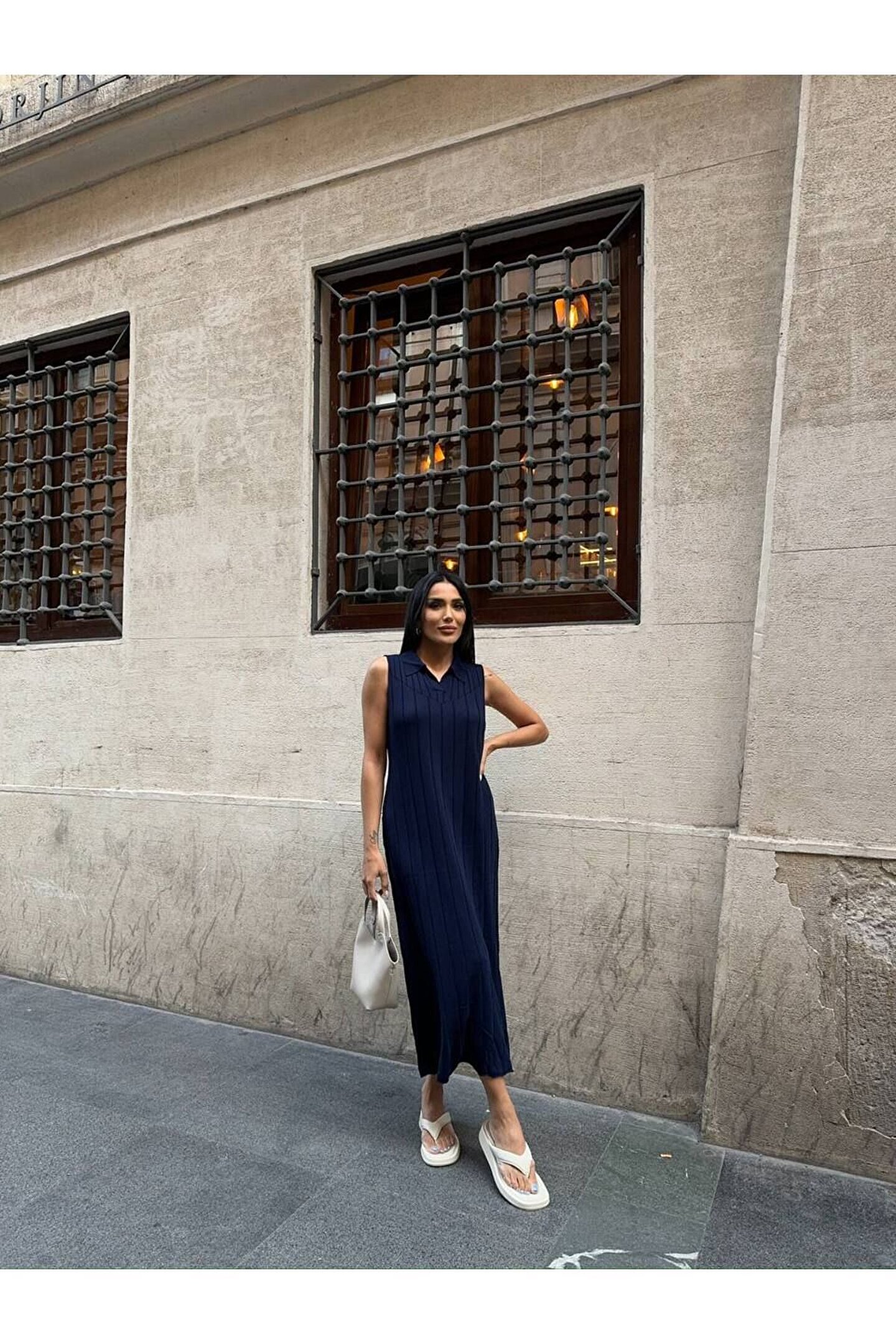 popibutik Gömlek Yaka Sıfır Kol Çizgi Desen Uzun Beyaz Triko Elbise