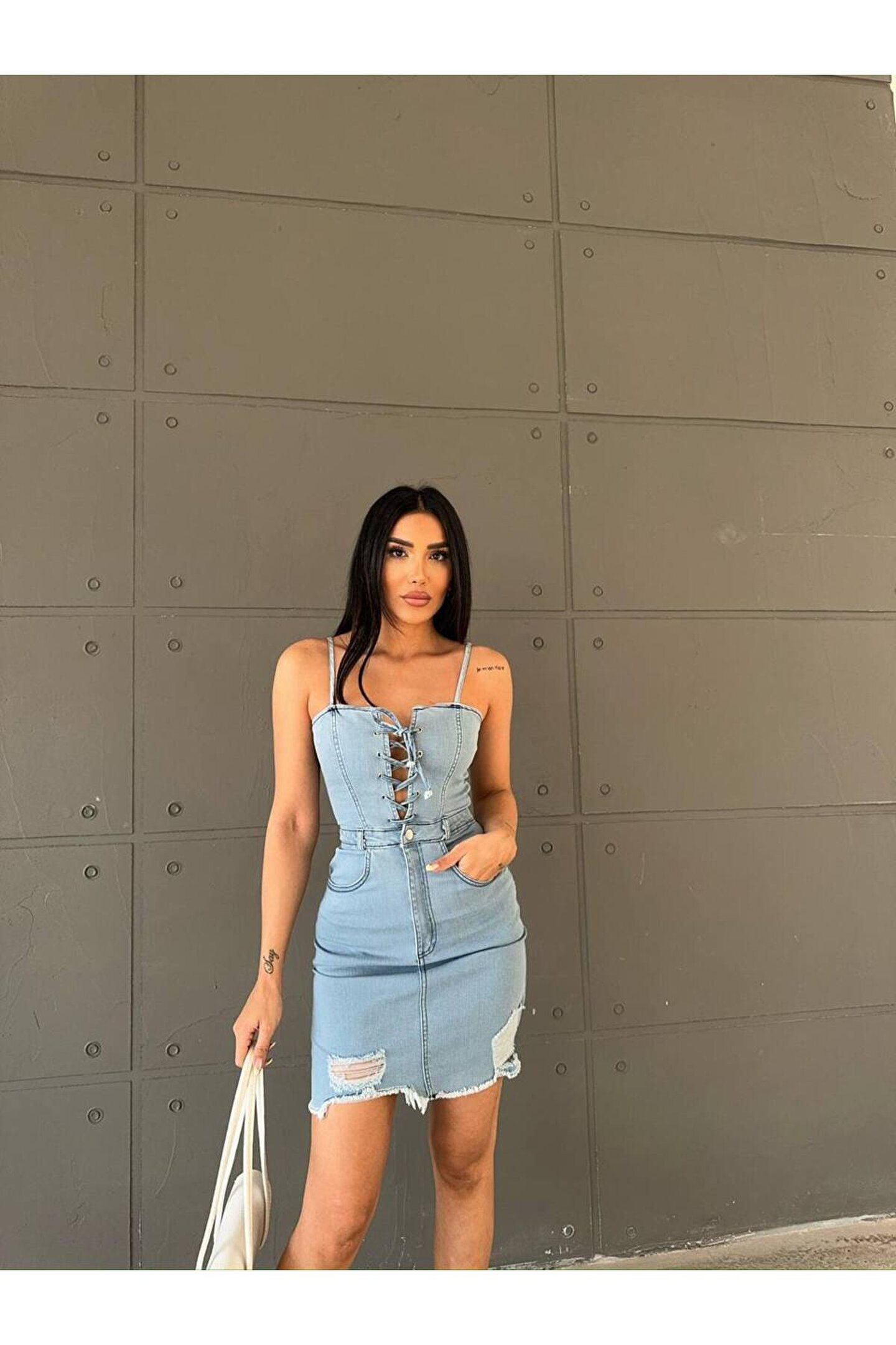 Yıkama sonrasında bile formunu koruyan likralı kumaş yapısı ile uzun süreli kullanım sunar; Her yaş grubuna hitap eden tasarımıyla gençlerin enerjisini yansıtan bir stil oluşturur; Denim kumaşın dayanıklılığı ve rahatlığı, günlük kullanım için idealdir; Askılı kol tasarımı ile yaz aylarında serinlik ve konfor sağlar; Yırtık detayları ile modern ve trend bir görünüm kazandırırken, eskitme/soluk efektli dokusuyla dikkat çeker; Bele oturan kalıbı sayesinde vücut hatlarını zarifçe sararak feminen bir siluet oluşturur; Mini boyu ile dinamik ve şık bir görünüm sunarken, farklı kombinlerle kolayca uyum sağlar;
