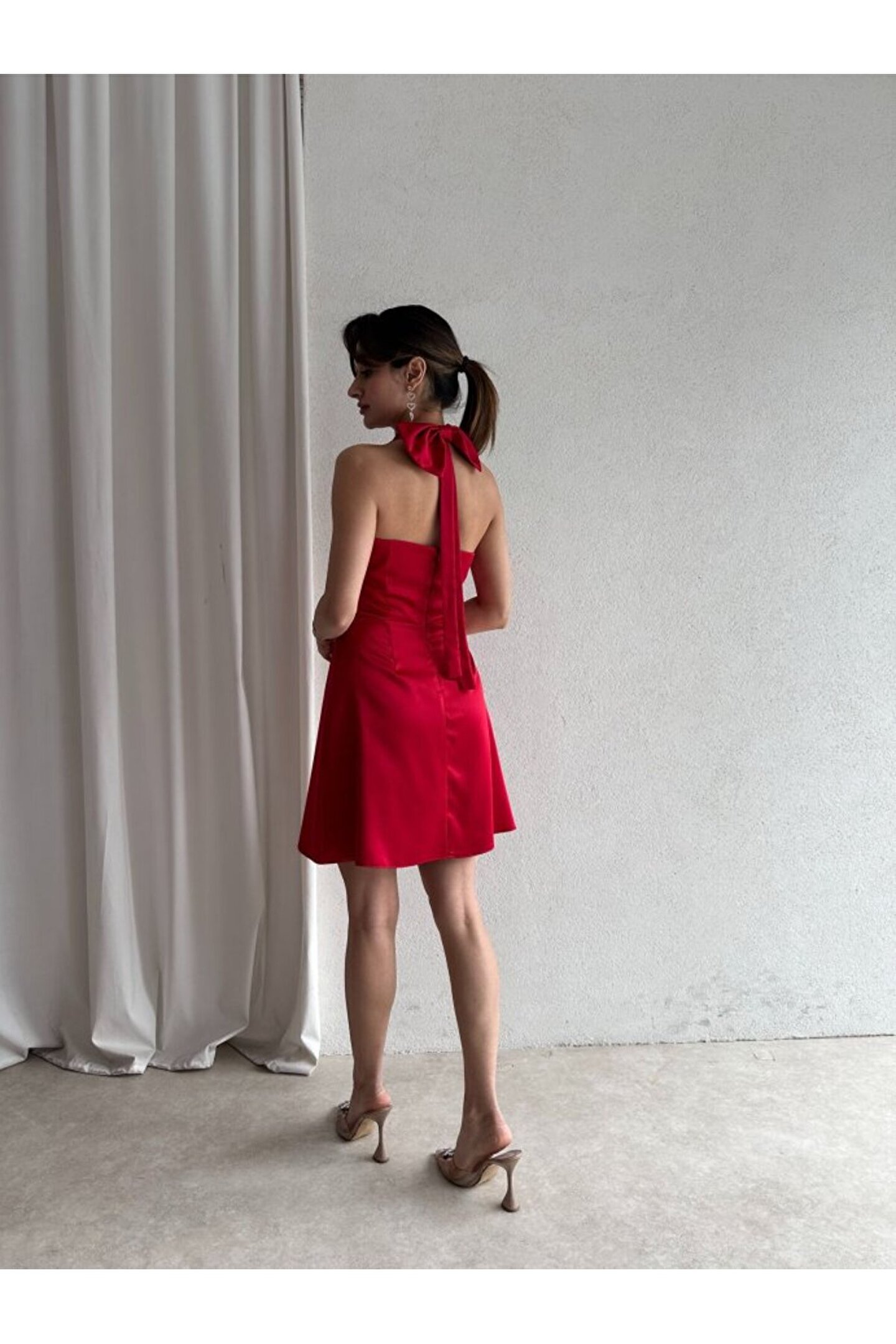 popibutik Kadın Boyundan Bağlamalı Kurdela Detaylı Mini Saten Elbise