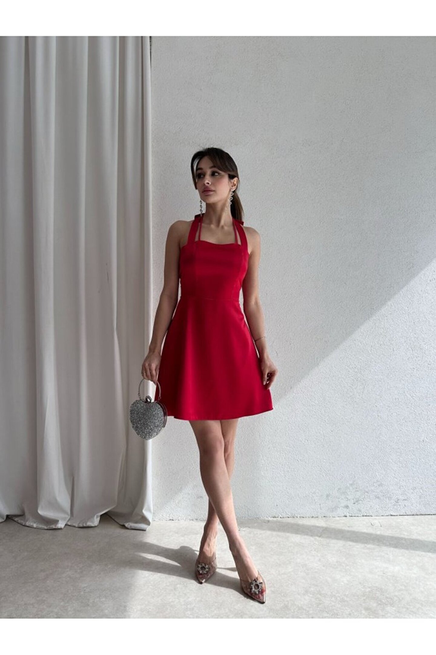popibutik Kadın Boyundan Bağlamalı Kurdela Detaylı Mini Saten Elbise