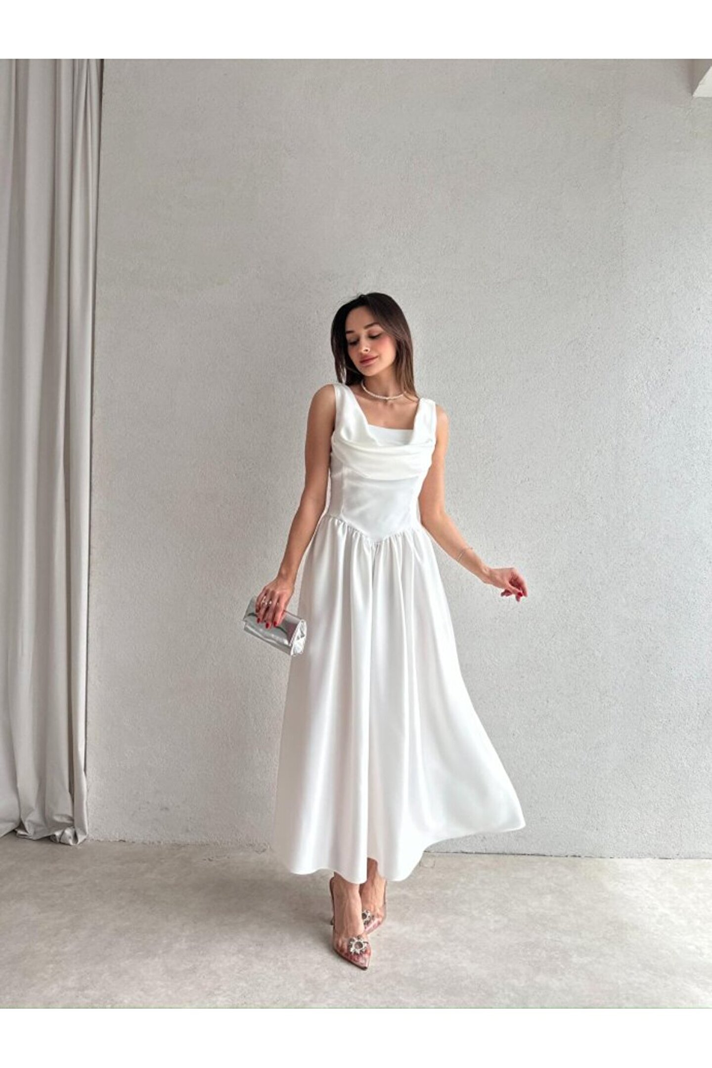 popibutik Kadın Sırt Detaylı Korse Formlu Pileli Uzun Saten Elbise