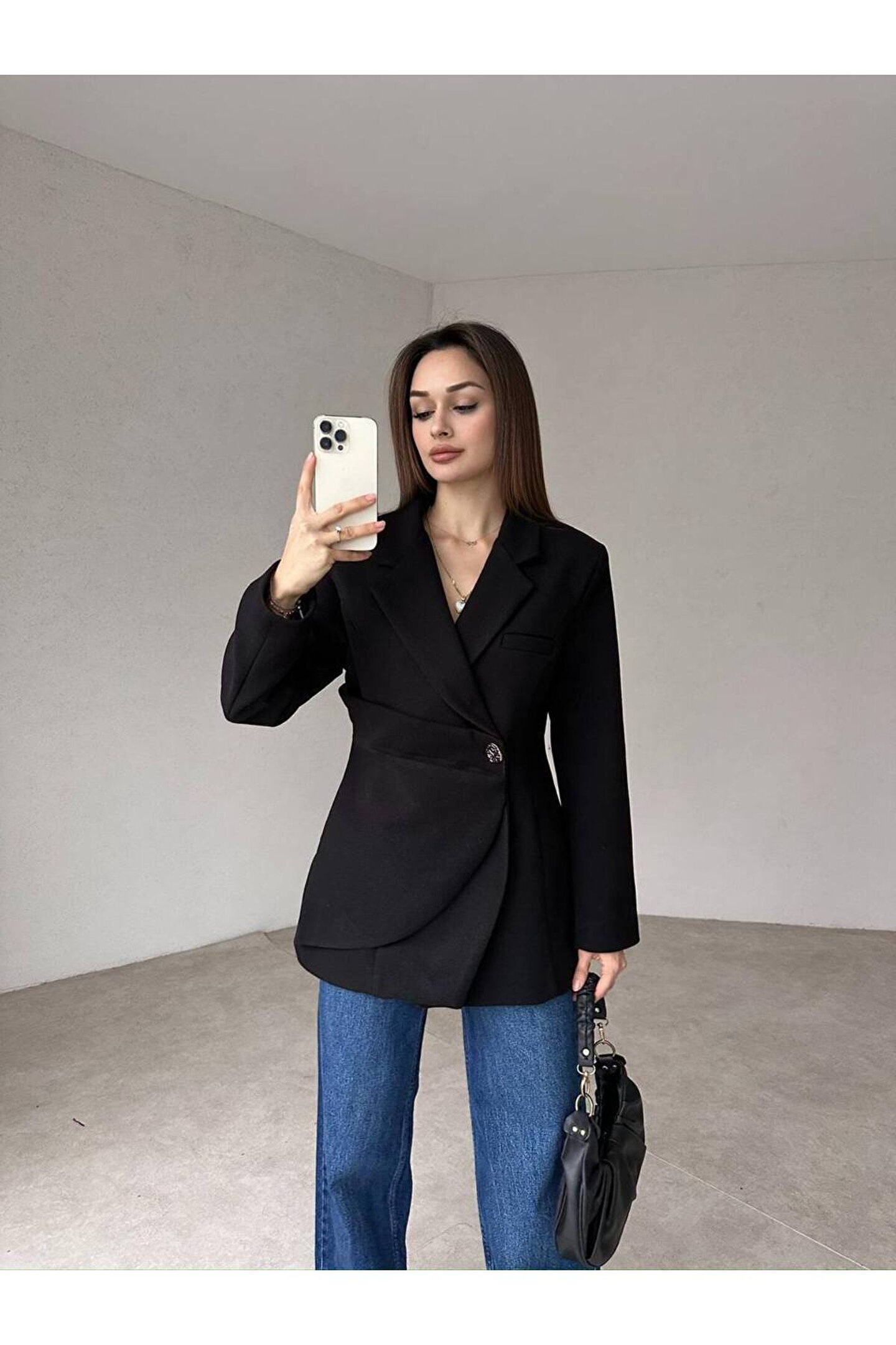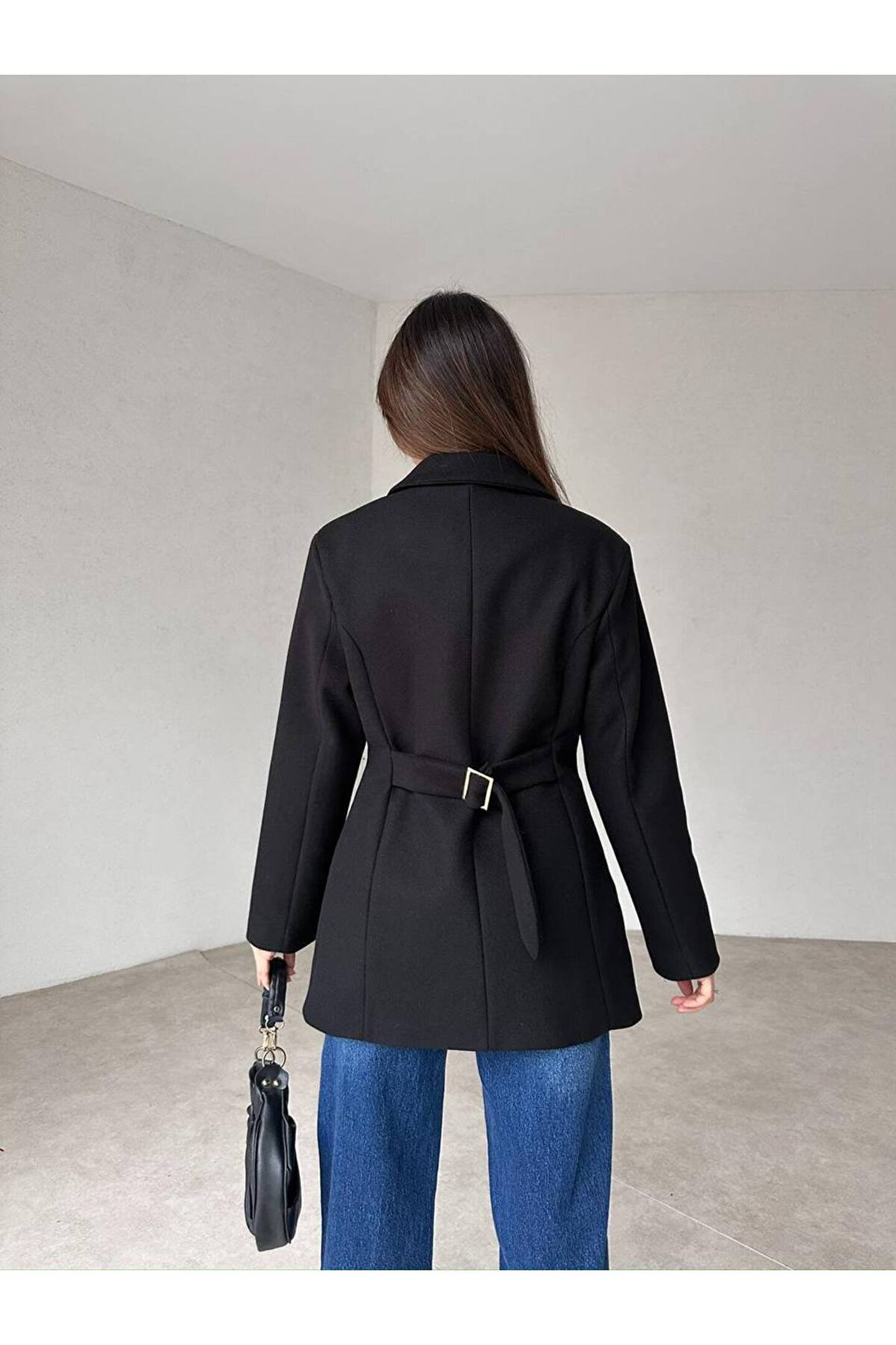 popibutik Kadın Yan Düğme Kaşe Kumaş Siyah Ceket Kaban