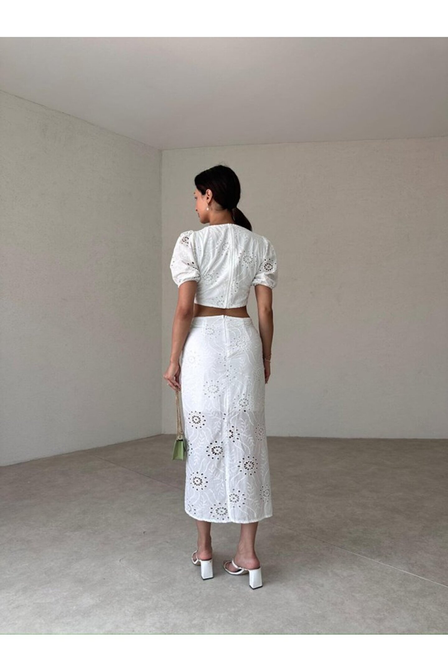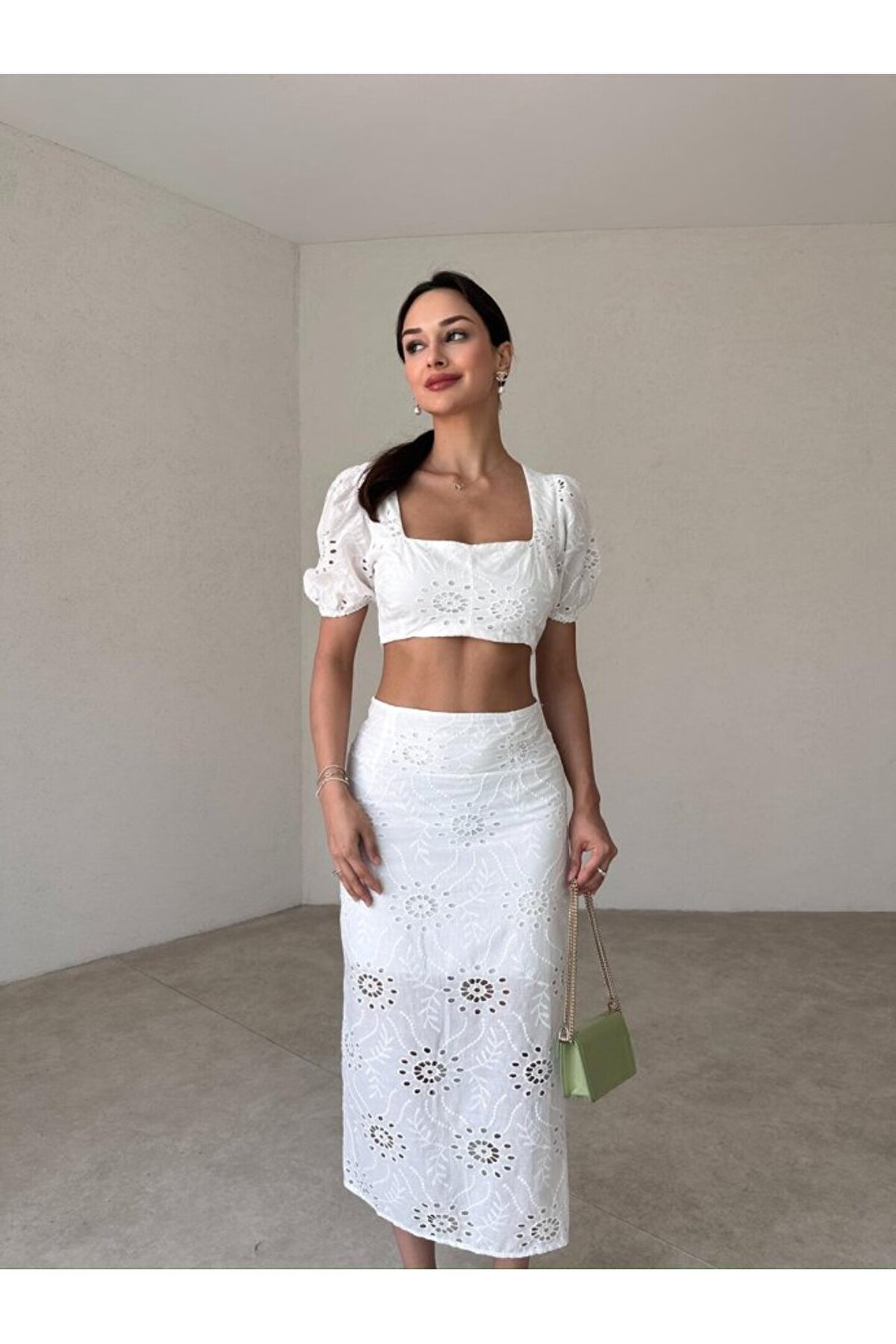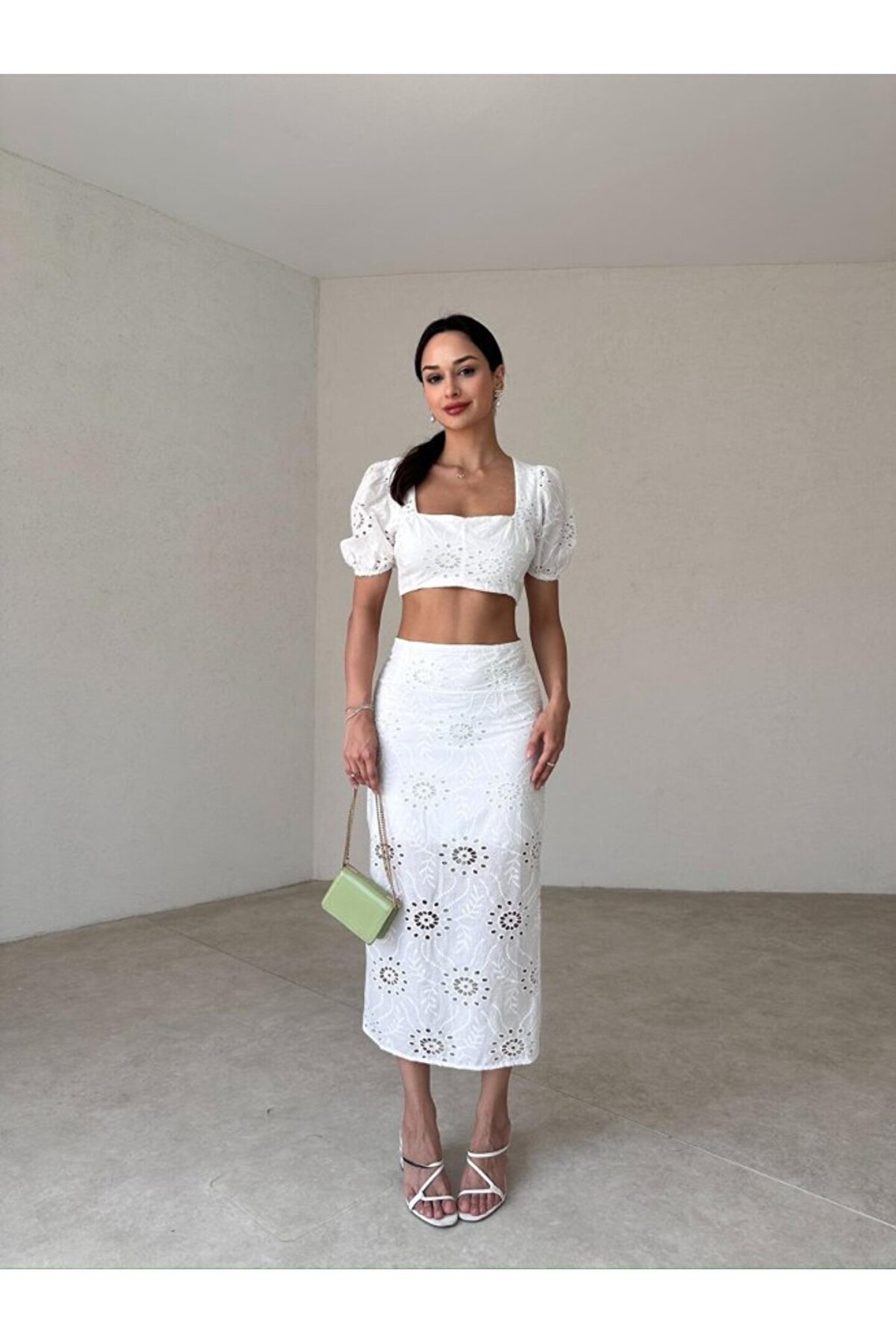 popibutik Kare Yaka Fisto Kumaş Etek Crop Beyaz Takım