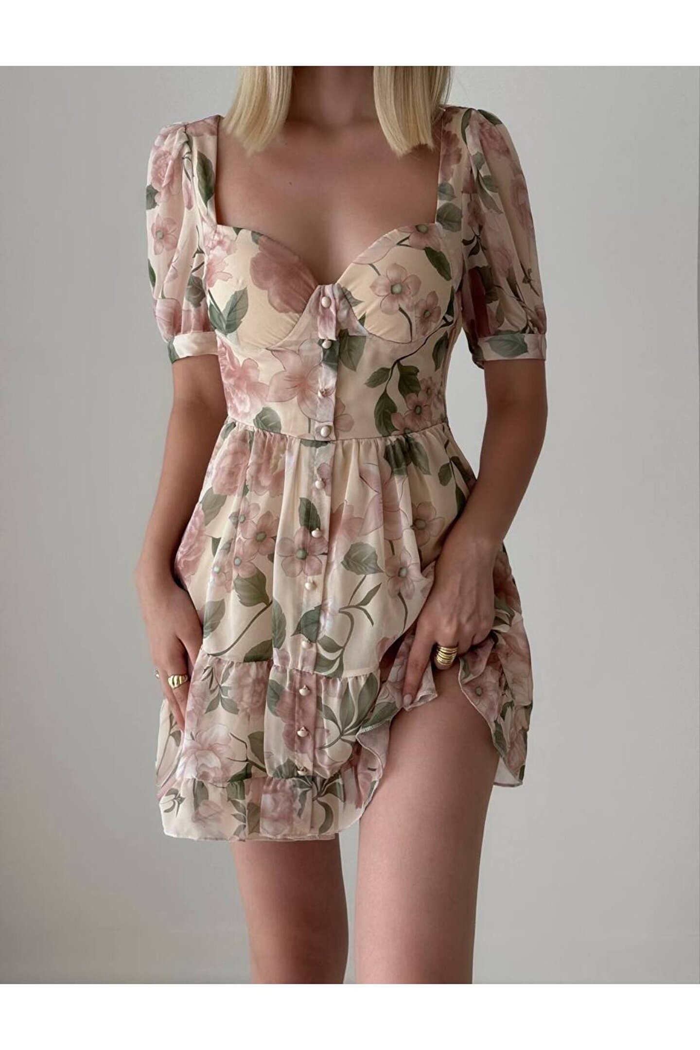 - Hafif ve zarif şifon kumaşı ile yaz aylarının vazgeçilmezi, mini boy elbise; - Belinizi saran bele oturan kalıbı sayesinde şık ve feminen bir siluet sunar; - Kısa kollu tasarımı ile rahat hareket etme özgürlüğü sağlar ve sıcak havalarda serinlik hissi verir; - Düğme detayları ile modern ve şık bir görünüm kazandırırken, genç yaş grubuna hitap eden dinamik bir stil oluşturur; - Şifon materyali sayesinde hafif ve nefes alabilen yapısıyla gün boyu konforlu bir kullanım sunar;