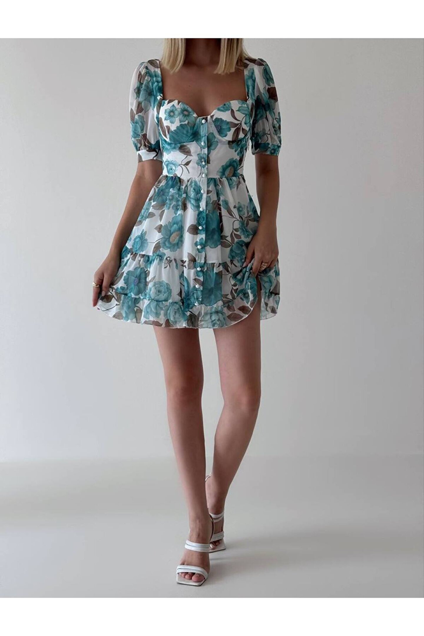 Zarif düğme detayları ile süslenmiş, şık ve modern bir görünüm sunar; Kısa kollu tasarımı sayesinde rahat hareket etme özgürlüğü sağlar; Hafif ve nefes alabilen şifon kumaşı, yaz aylarında serinlik ve konfor sunar; Mini boyu ile feminen ve dinamik bir stil yaratır; Belirtilmemiş kumaş tipi, esneklik ve rahatlık için idealdir; Bele oturan kalıbı sayesinde vücut hatlarını zarifçe sarar ve şık bir siluet oluşturur; Genç yaş grubuna hitap eden tasarımıyla enerjik ve canlı kombinler için uygundur; Şifon materyali, hafifliği ve zarafetiyle dikkat çekerken, kolay bakım imkanı sunar;