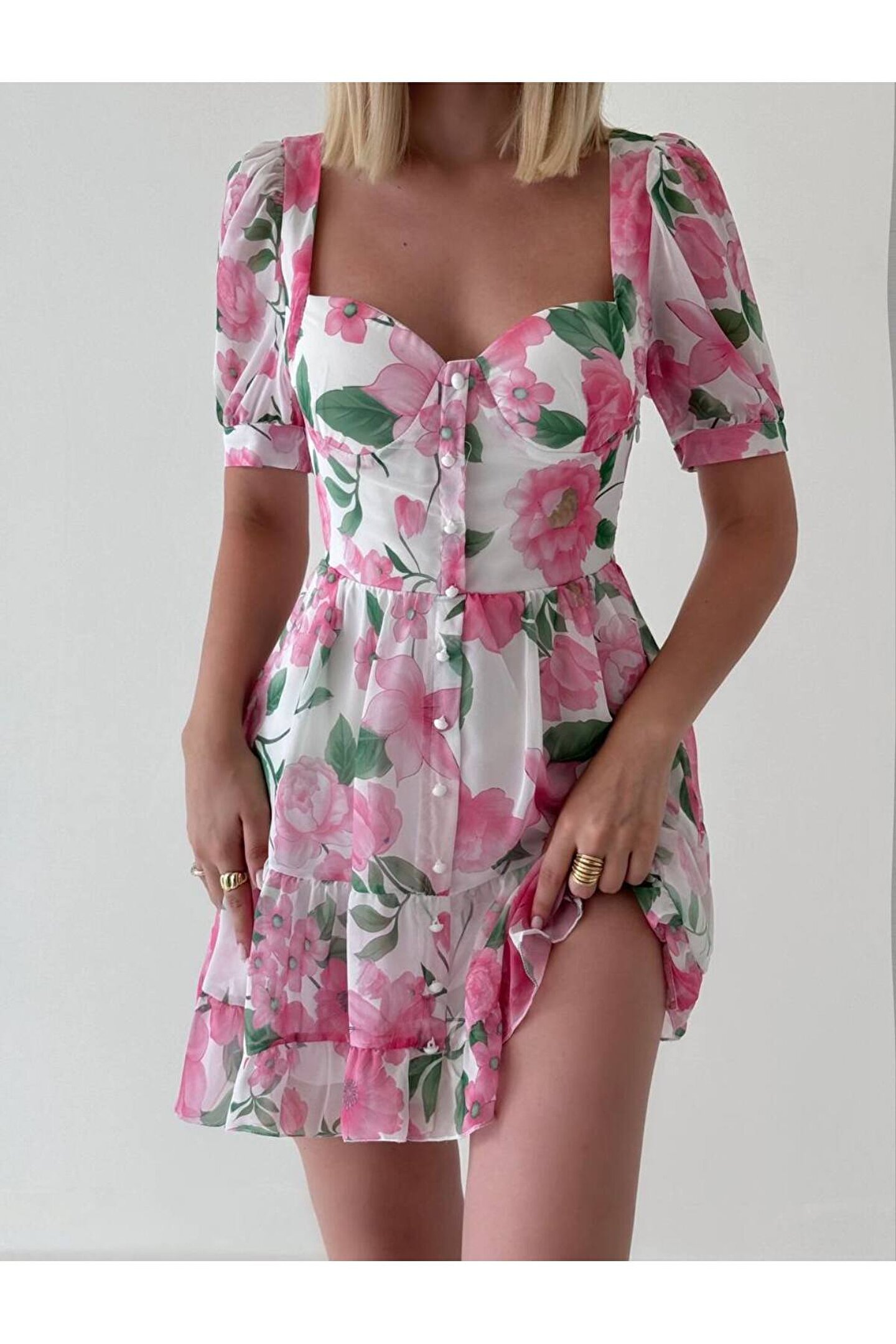 popibutik Kısa Kol Gloplu Düğme Detaylı Şifon Kumaş Mini Pembe Elbise