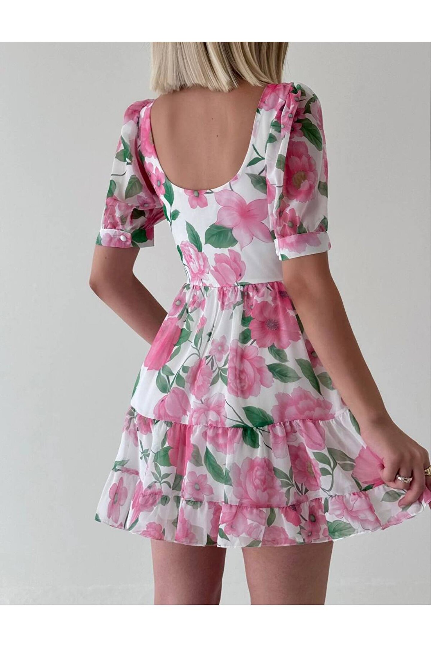 popibutik Kısa Kol Gloplu Düğme Detaylı Şifon Kumaş Mini Pembe Elbise