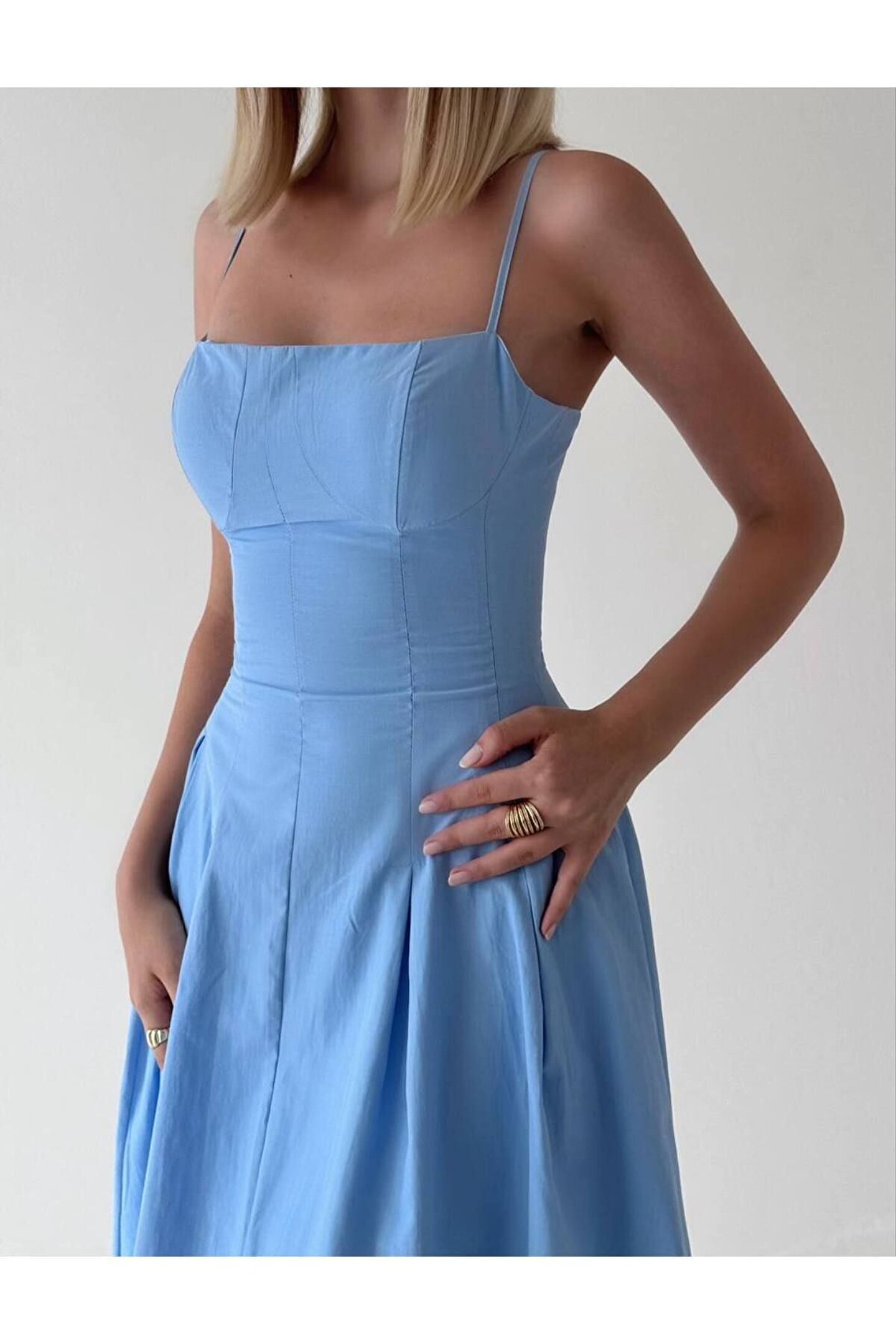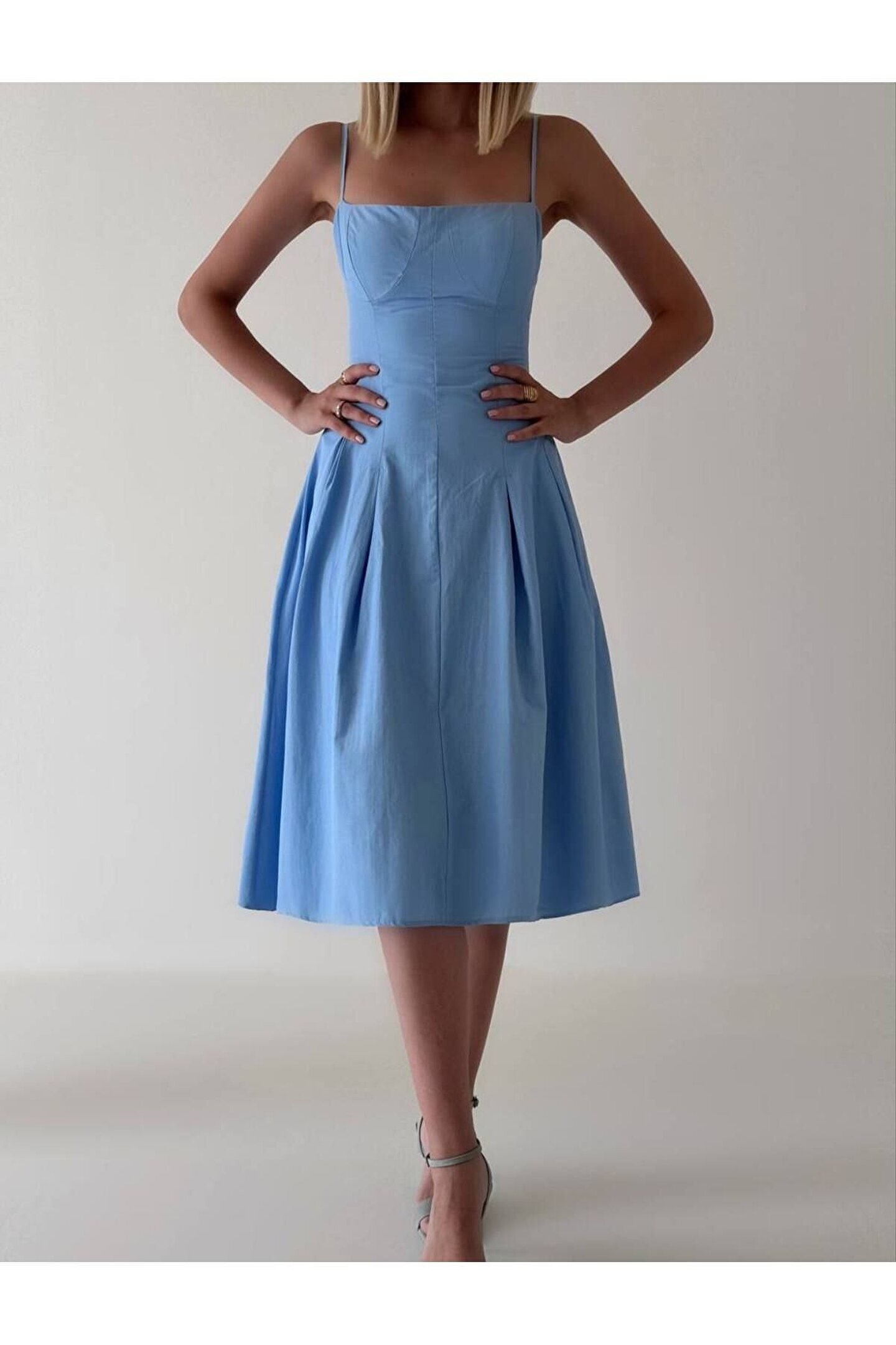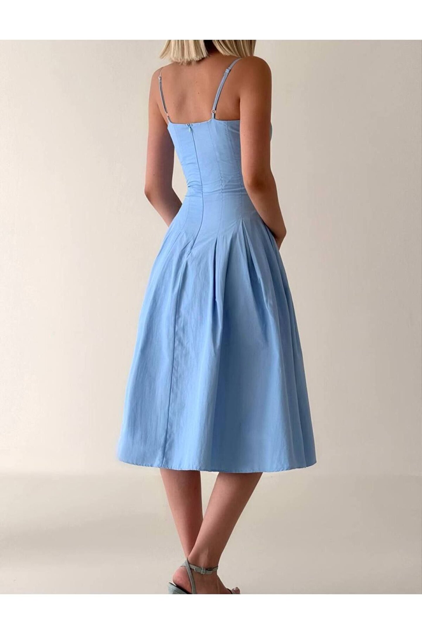 popibutik Pile Etek İnce Askılı Korse Formlu Poplin Kumaş Mavi Midi Elbise