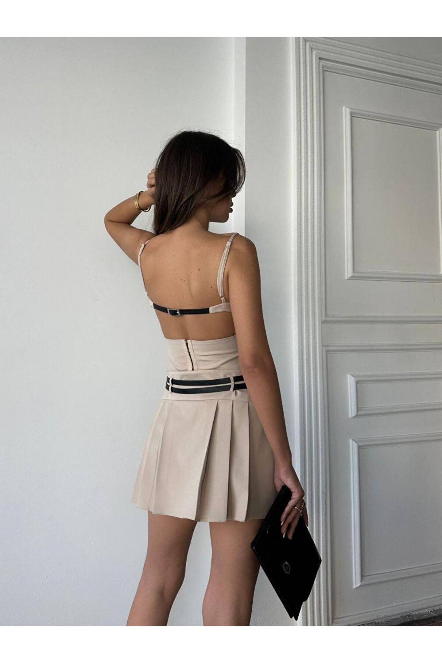 popibutik Sırt Dekolteli Kemerli Pileli Etek Likralı Mini Elbise