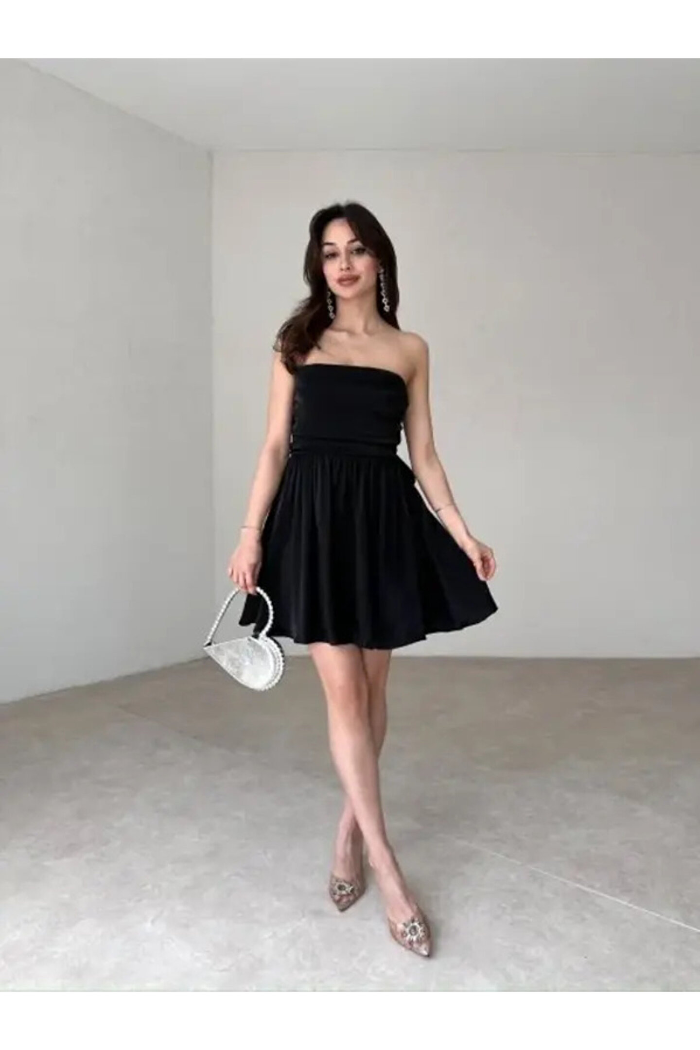 popibutik Sırt Fiyonk Bağlamalı Straplez Mini Parlak Saten Siyah Elbise