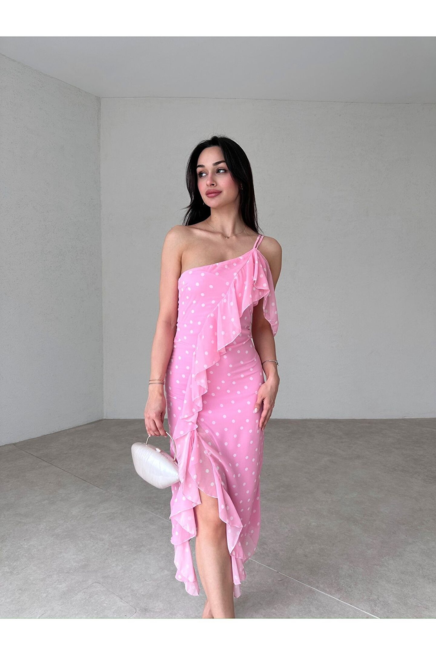 popibutik TEK OMUZ FIRFIRLI PEMBE MİDİ BOY ŞİFON ELBİSE