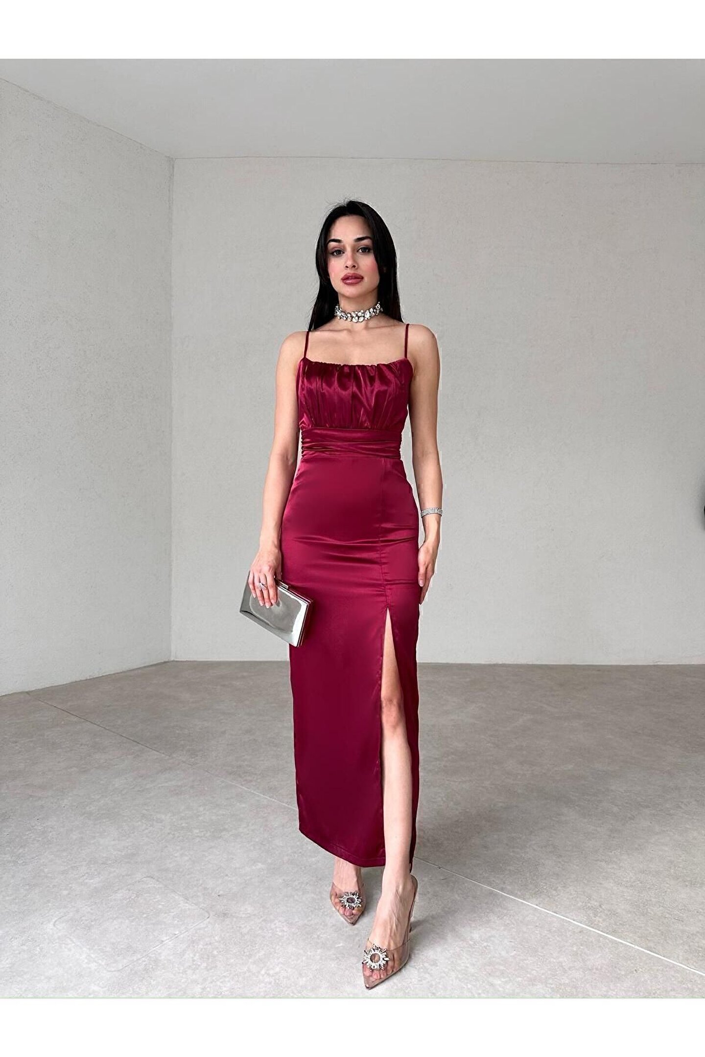 popibutik YIRTMAÇ DETAYLI ASKILI SATEN ELBİSE