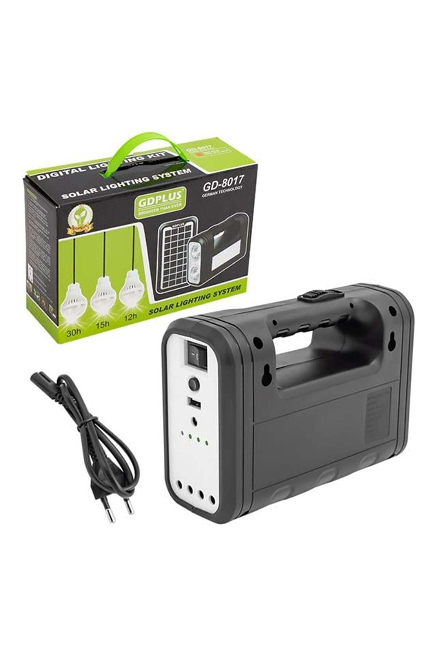 Powermaster GD-8017S Solar Panelli 3 Ampullü Solar Aydınlatma Sistemi; bu kompakt ve kullanışlı solar panelli aydınlatma seti, güneş enerjisi ile aydınlatma ihtiyacınızı karşılamak için ideal bir çözümdür. Mobil aydınlatma ve şarj ihtiyacı olan her yerde kullanım için idealdir. USB Çıkışı ile powerbank olarak kullanılabilme özelliği ssayesinde kamp ve benzeri aktivilerde çok rahat kullanılabilir.