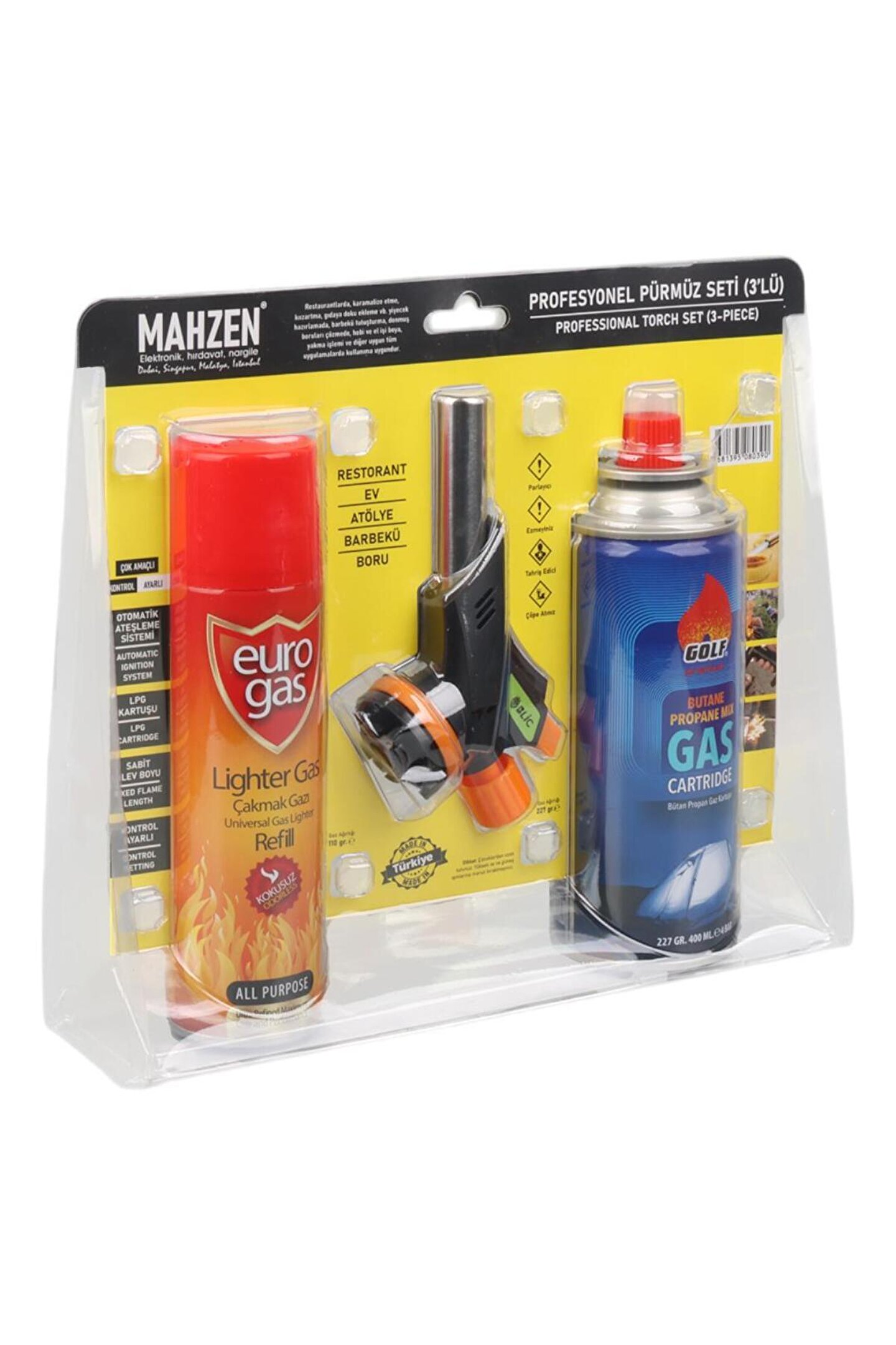 Mahzen Profesyonel 3'lü Pürmüz Başlığı Seti (Butan Propan Gaz Kartuşu 400ML Çakmak + Çakmak Gazı 270ML) Özellikleri