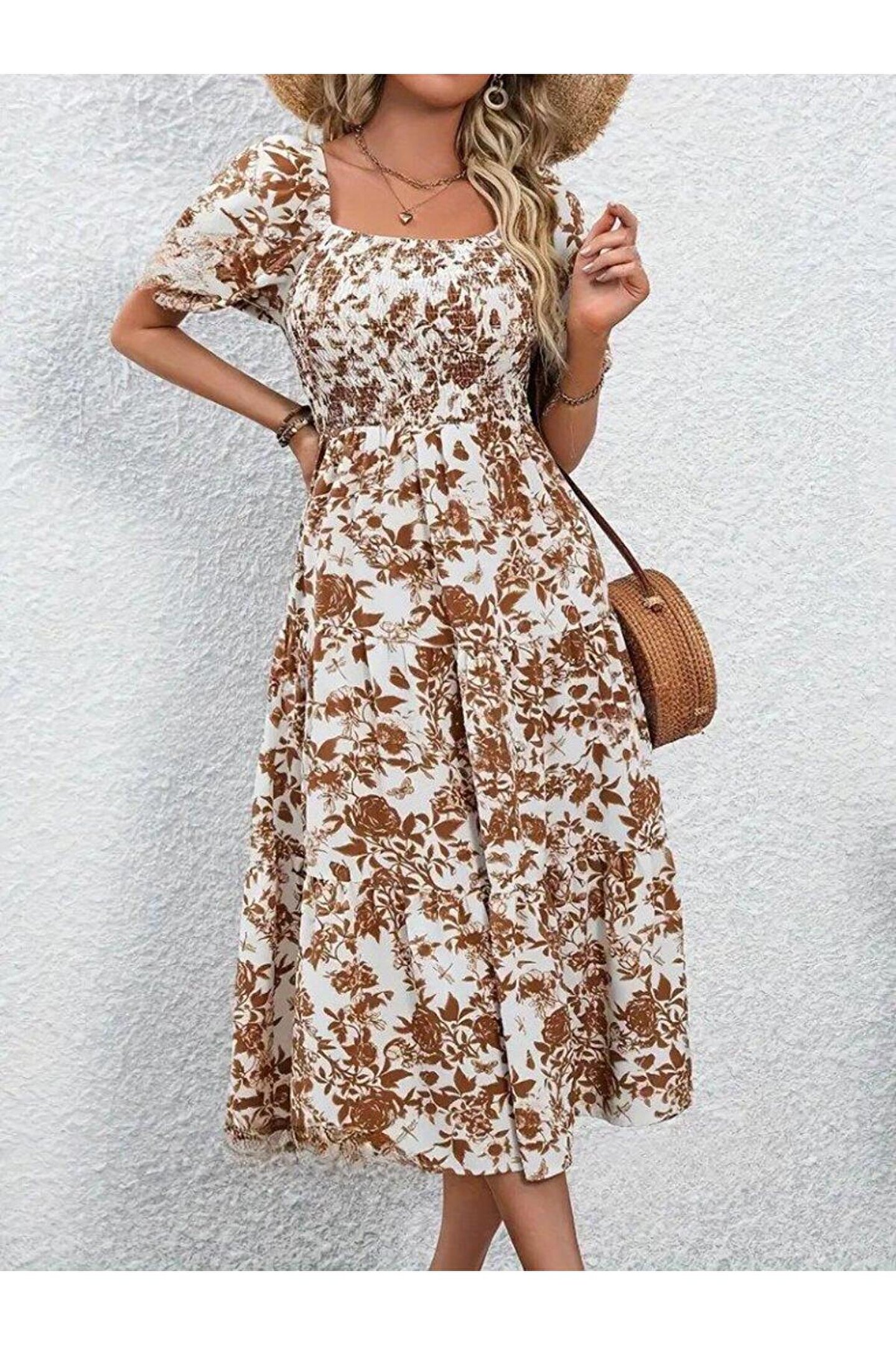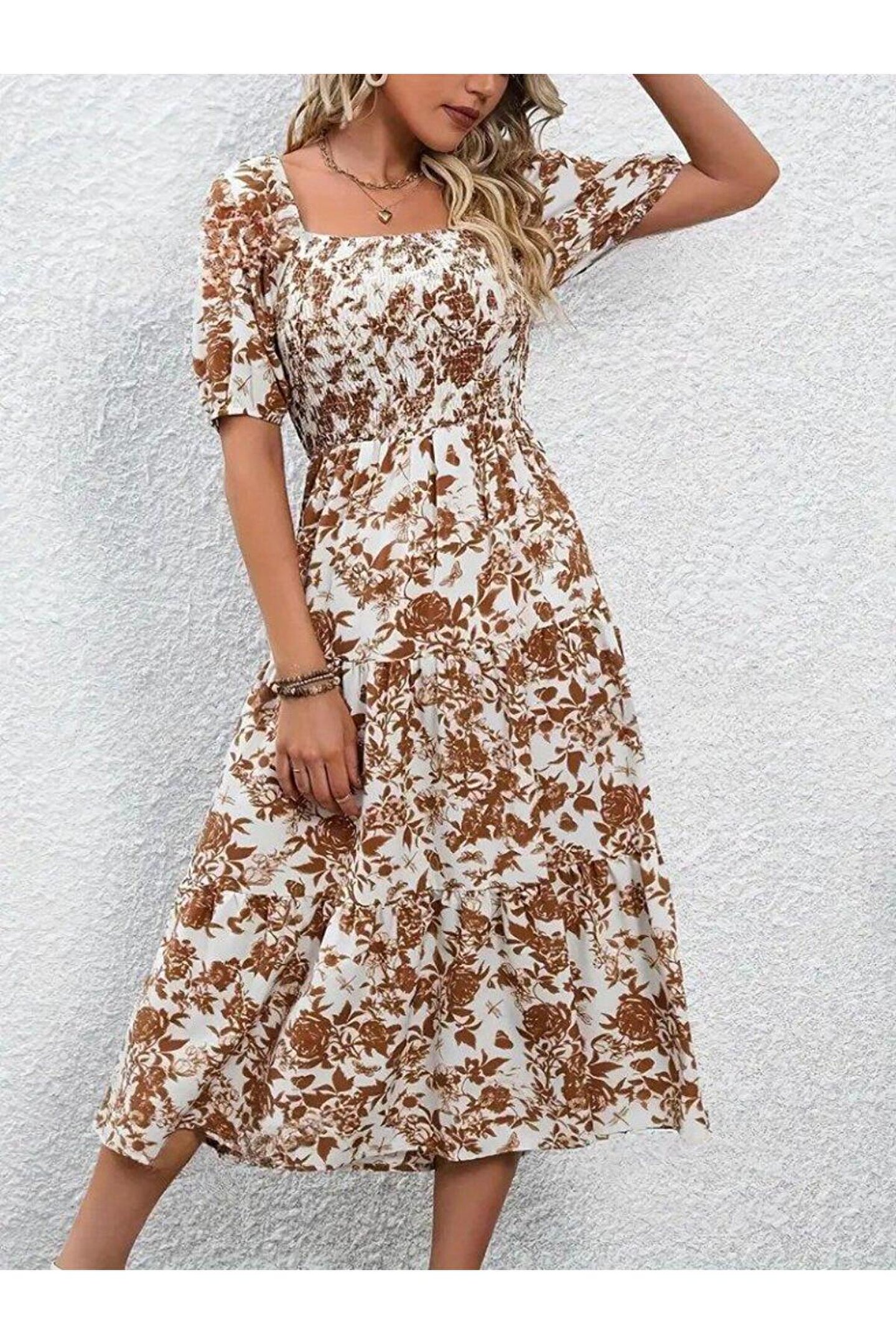 Kadın Kısa Kollu Kare Yakalı Lastikli Desenli Süprem Elbise
