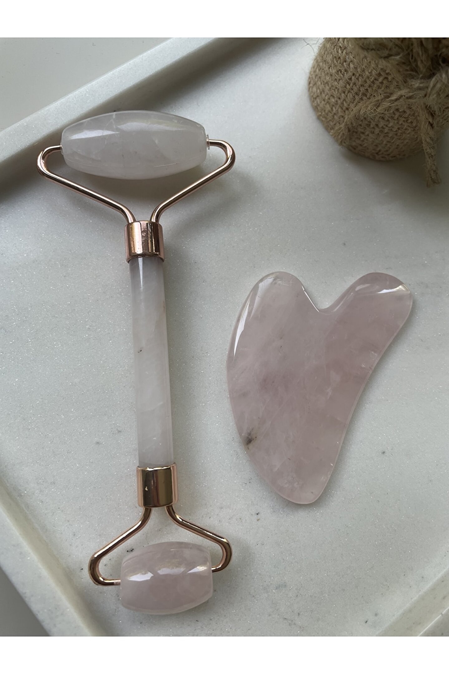 Pembe Kuvars Face Roller Ve Kalp Gua Sha Masaj Taşı