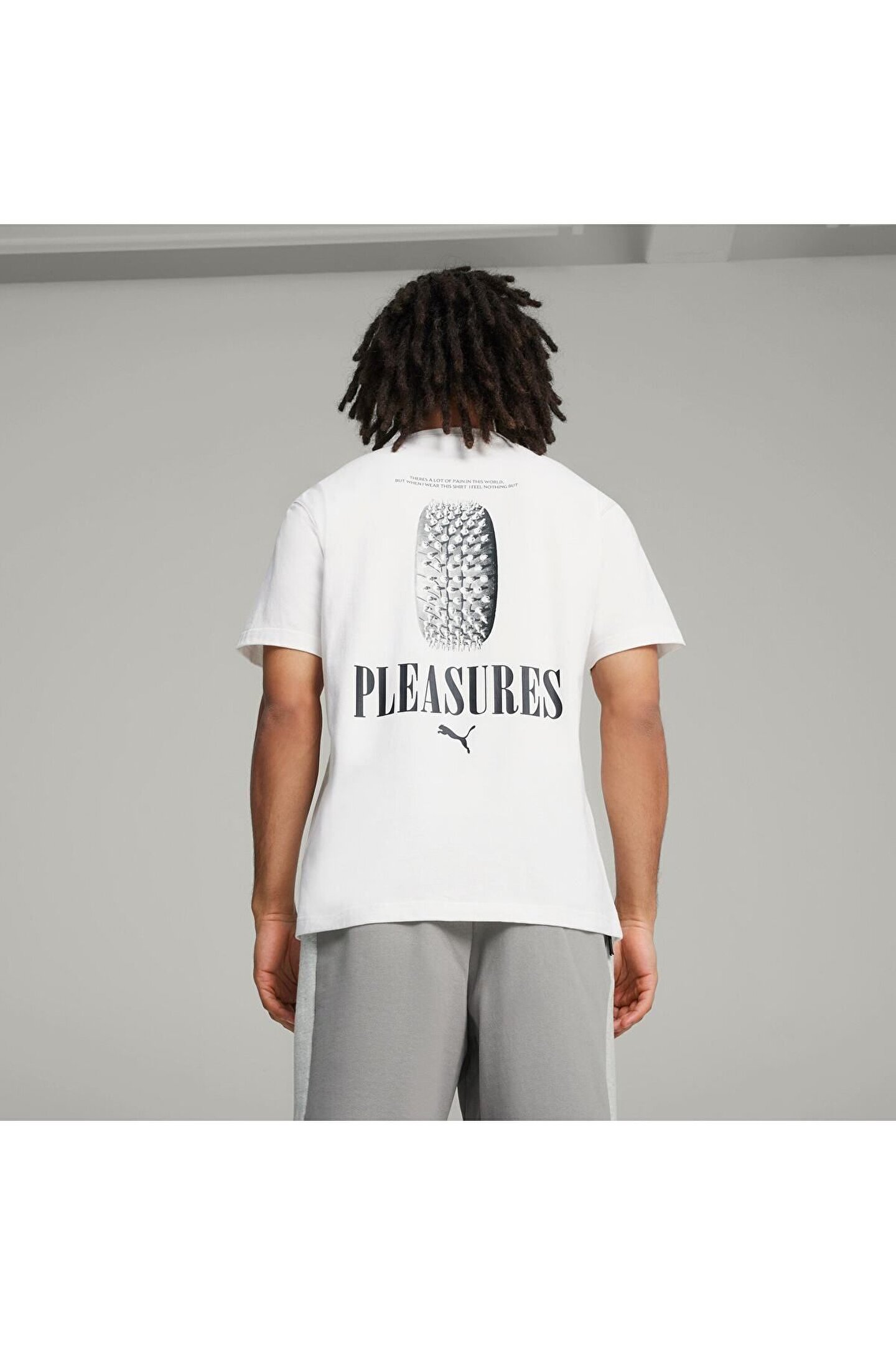 624096_02-ÜRÜN HİKAYESİ ÜRÜN HİKAYESİ PUMA x PLEASURES'ı selamla.; Sokak giyim markası PLEASURES, 2015 yılında Los Angeles'ta kuruldu ve çağdaş modaya punk ve grunge yaklaşımlarıyla tanınıyor.; Bu sezondaki stiller, şekillendirici tasarımlar ve tamamen teknik ayrıntılarla ilgili mühendislik malzemeleriyle motor sporlarından ilham alıyor ve rahat kesimi, yoğun jarse yapısı ve çarpıcı desen baskılarıyla bu tişört açıkça sahneden etkileniyor.; ÖZELLİKLER & FAYDALAR En az %20 geri dönüştürülmüş pamuktan üretilmiştir DETAYLAR Rahat kesim li> 230 gsm, süprem Bisiklet yaka Kısa kol Ön tarafta desen işlemeli Arka tarafta desen baskı