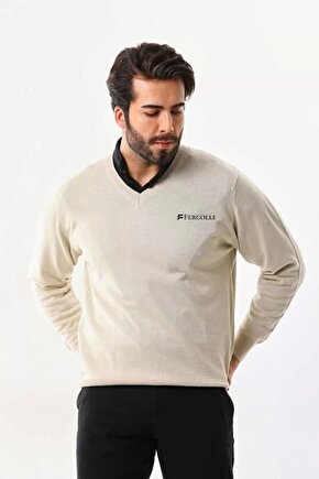 Queene Dreams Baskılı V Yaka Uzun Kol Dokuma Triko - Bej