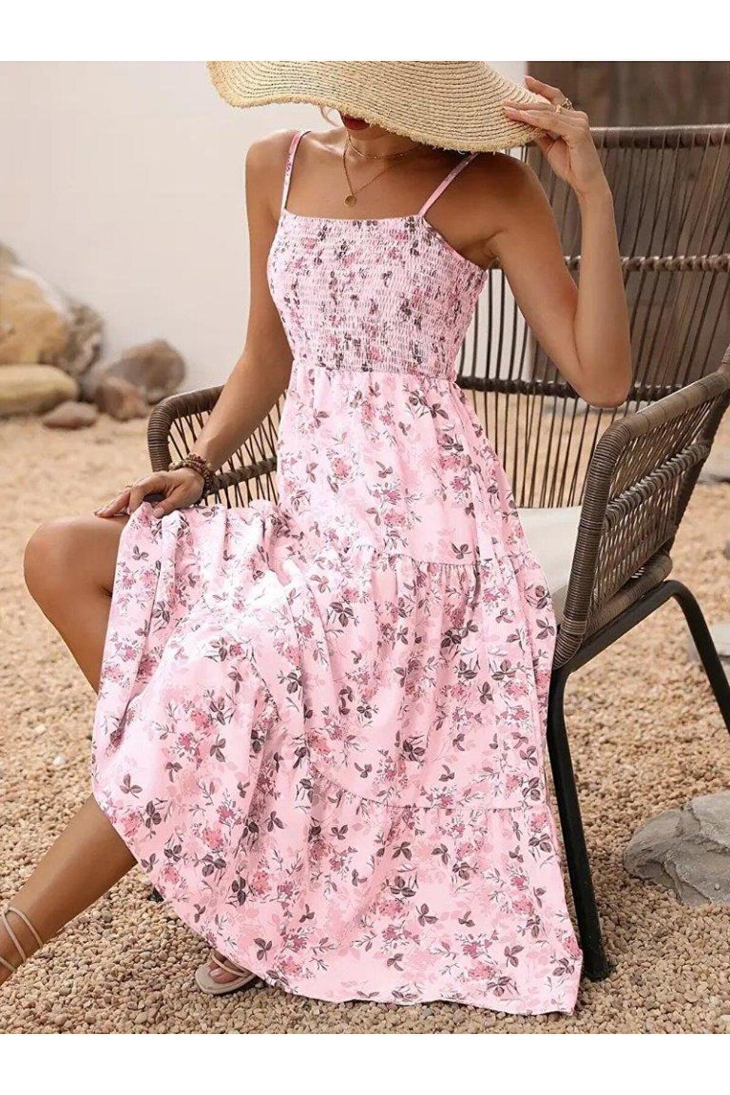 Kadın Ip Askılı Geniş V Yakalı Desenli Uzun Süprem Elbise