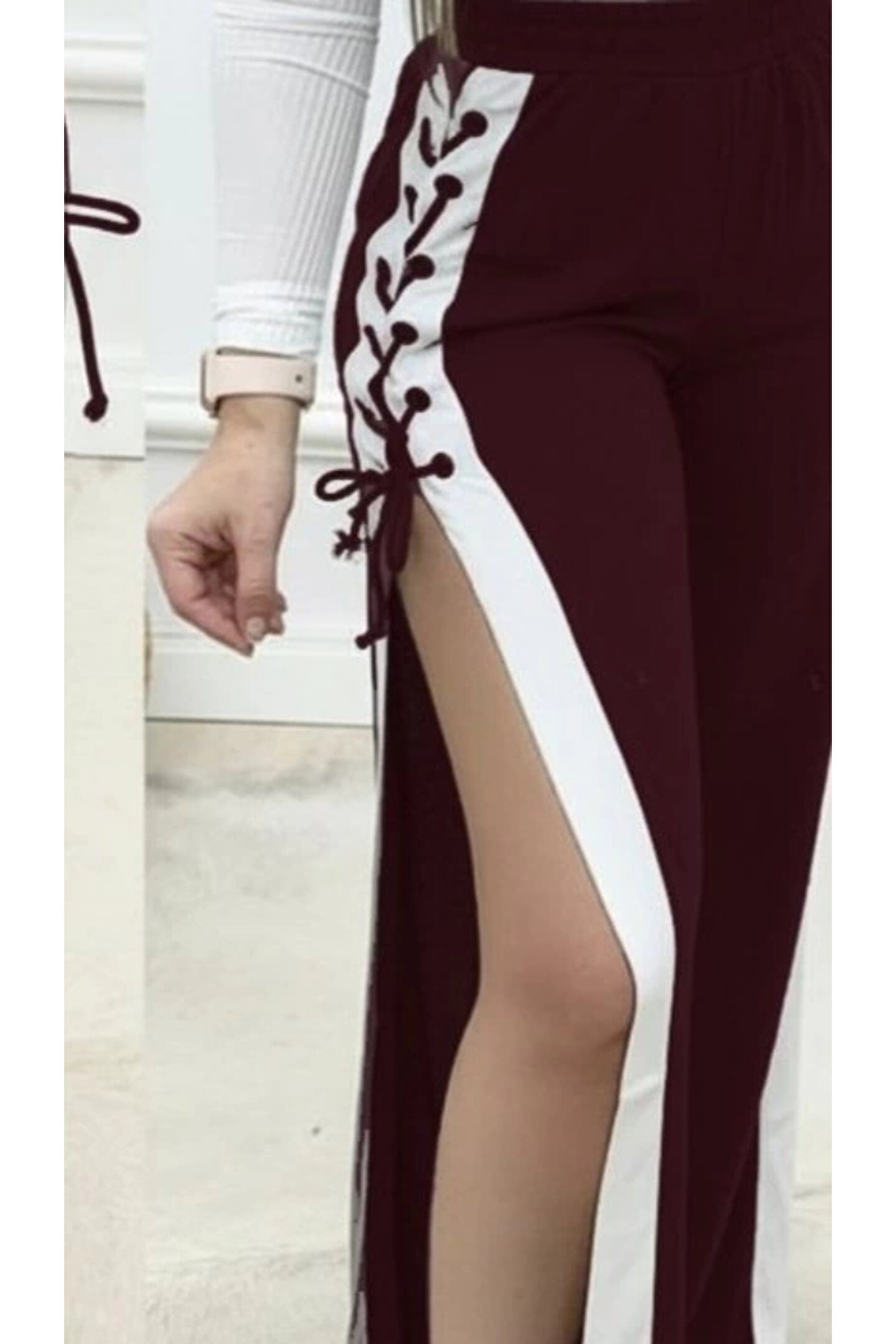 Kadın Yüksek Bel Yandan çapraz Bağcıklı Yırtmaçlı Viskon Iki Iplik Pantolon