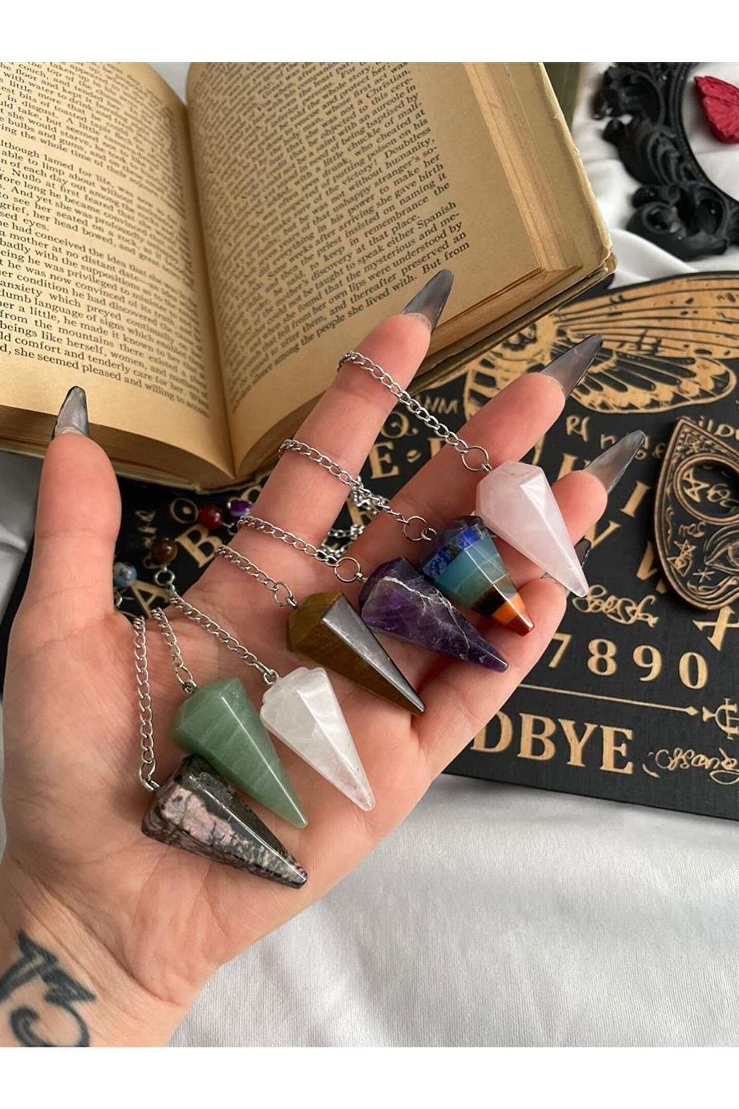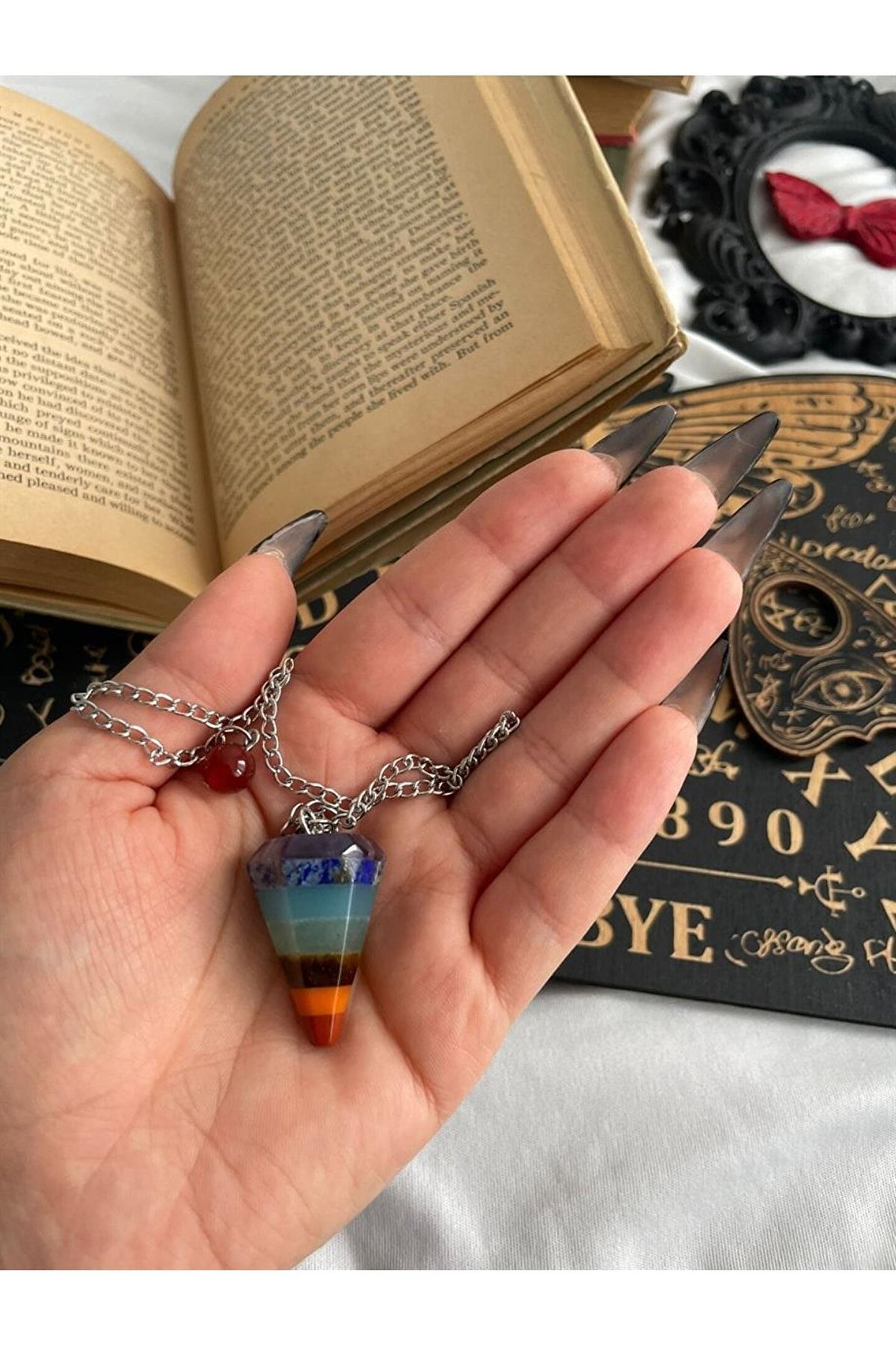 Doğal taş kullanımı sayesinde her bir pandül, benzersiz ve otantik bir görünüm sunar; 7 çakra enerjisini dengelemek için tasarlanmış bu kolye, kişisel şifa ve meditasyon ritüellerinizde size eşlik eder; Taş materyali ile hem estetik hem de doğallığı bir arada sunarak, günlük kullanım için idealdir; Her bir pandülün zarif sallanışı, enerji dengenizi korumanıza yardımcı olurken aynı zamanda stilinizi de tamamlar;