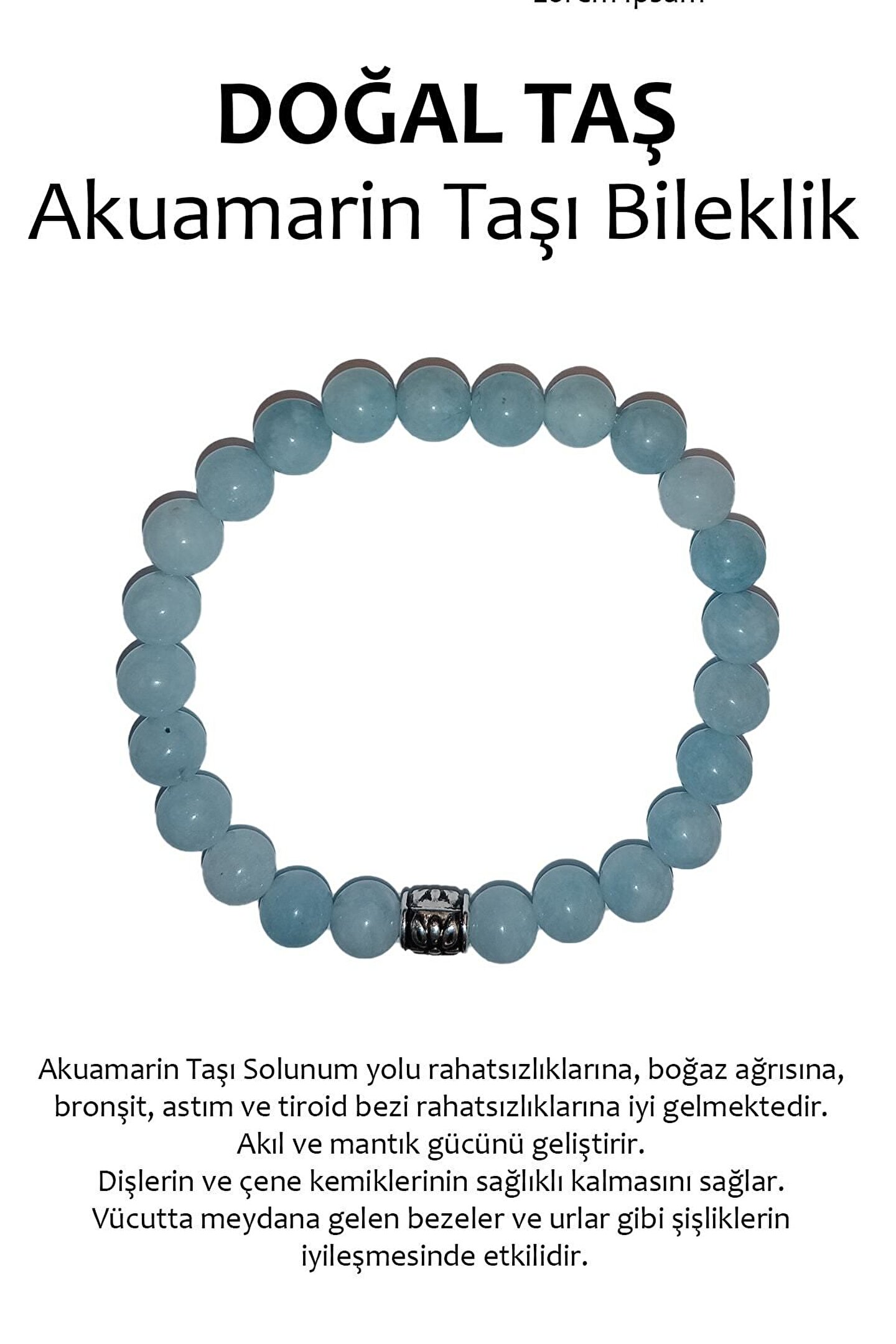 Doğal taş bileklik, akuamarin (aquamarin) taşı kullanılarak üretilmiştir, bu da her bilekliğe eşsiz bir zarafet ve doğallık katar; Akuamarin taşı, mavi renk tonuyla dikkat çeker ve bu bileklikte bu doğal güzelliği parmaklarınıza taşır; Doğal taş materyali sayesinde, her bileklik benzersiz bir dokunuşla öne çıkar ve kişisel stilinizi yansıtır; Akuamarin taşı, hem şıklığı hem de enerjiyi temsil eder; bu bileklik, günlük kullanım için ideal bir aksesuardır;