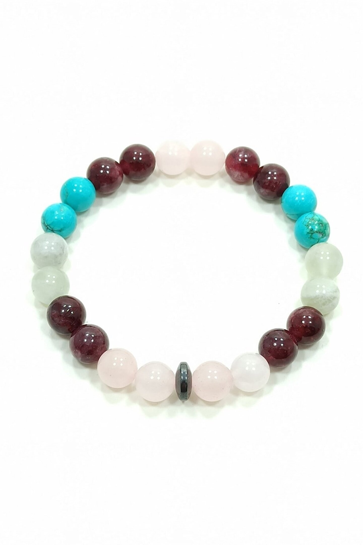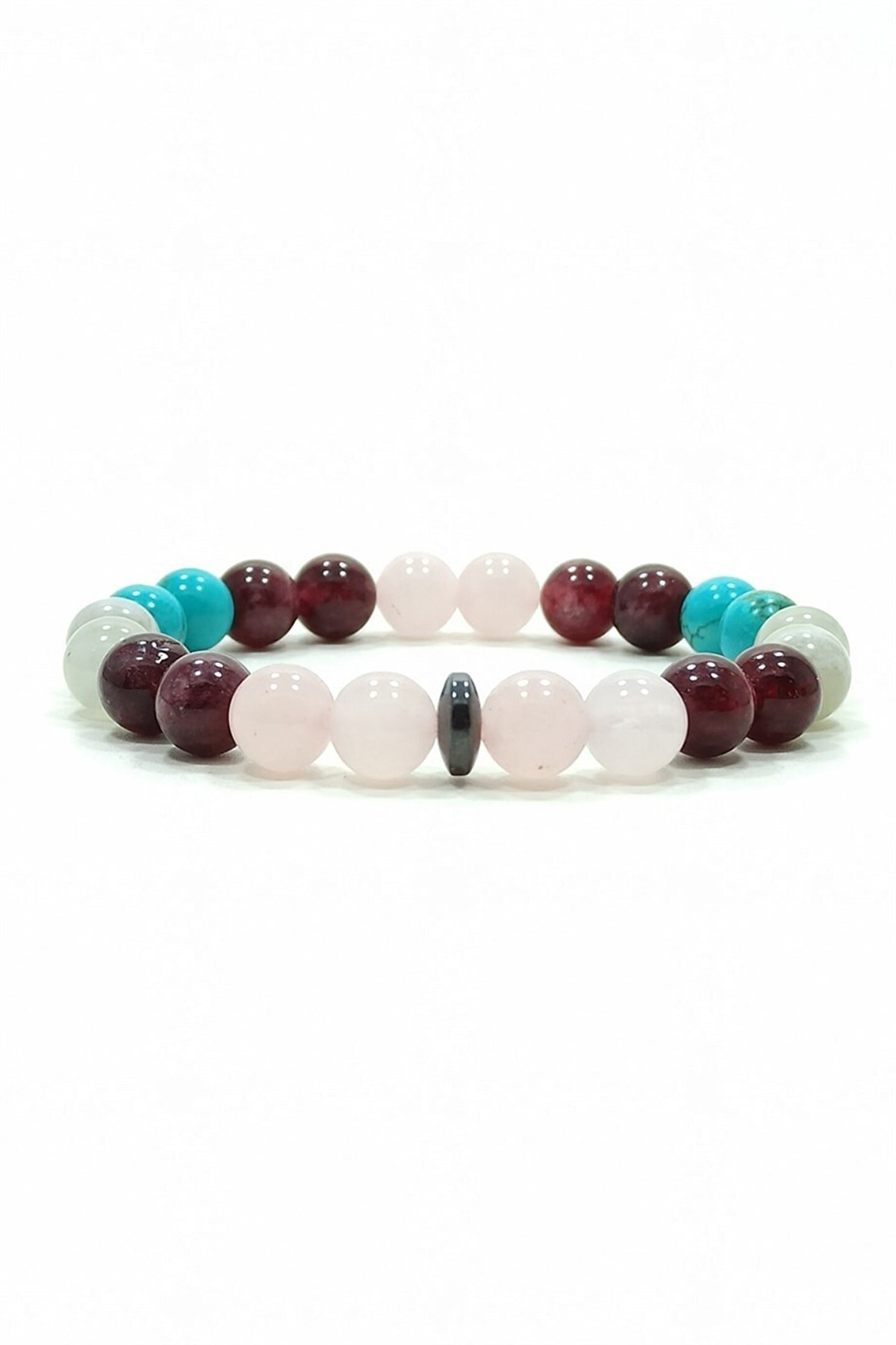Bu özel bileklik, pembe kuvars granat(lal) aytaşı ve turkuaz doğal taşların eşsiz birleşimiyle tasarlanmıştır; Doğal taşların enerjisinden ilham alarak hazırlanan bu bileklik, stilinizi doğal güzelliklerle buluştururken aynı zamanda pozitif enerjileriyle ruhunuzu da canlandırır; Cazibe bilekliği, her tür kıyafetinizle uyum sağlayarak göz alıcı bir aksesuar oluşturur; ;;