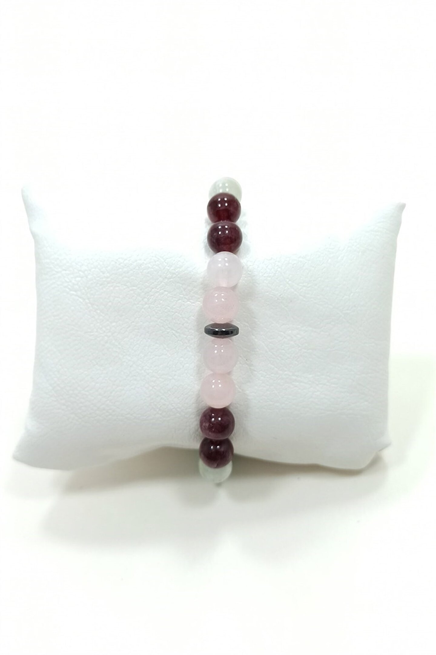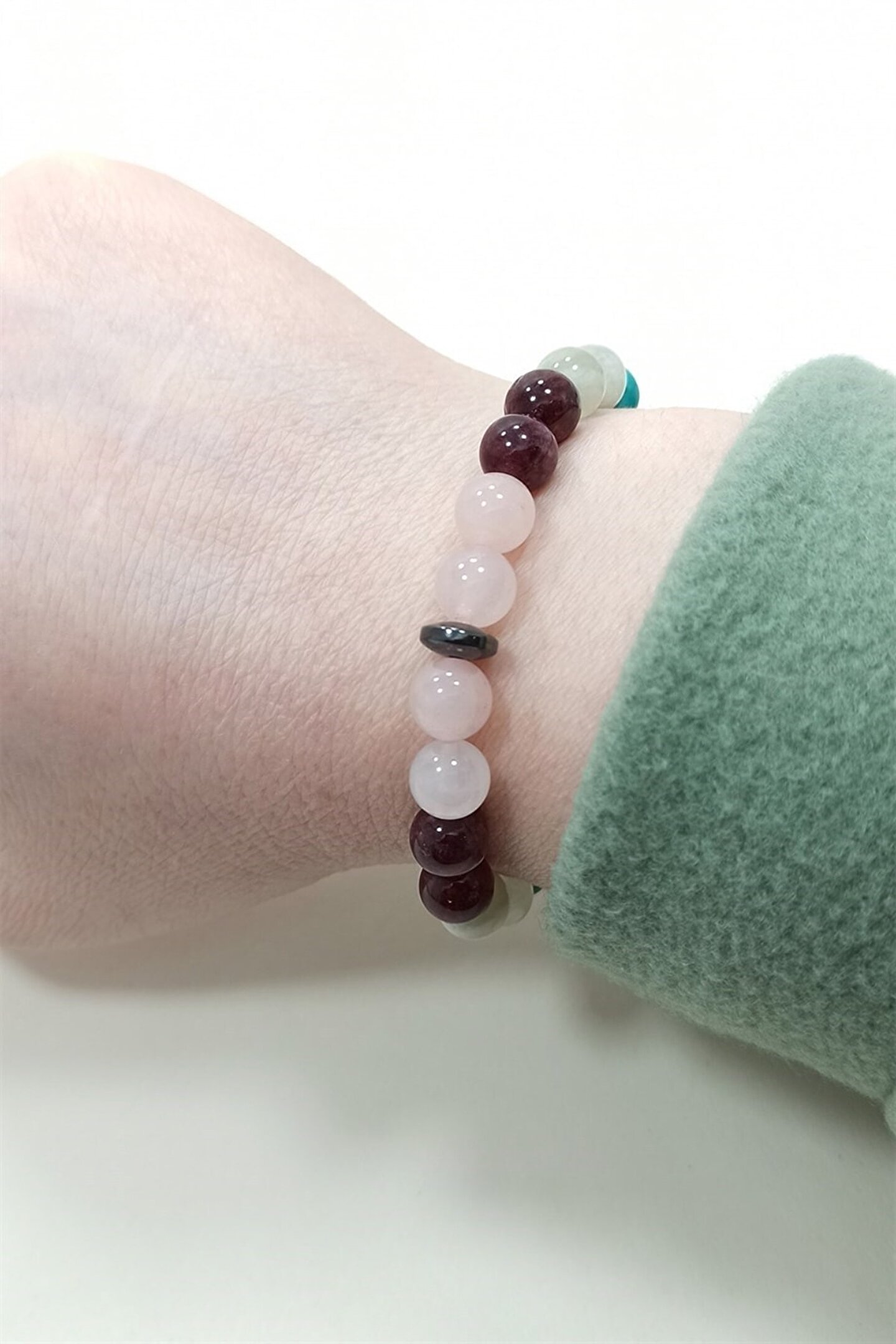 Bu özel bileklik, pembe kuvars granat(lal) aytaşı ve turkuaz doğal taşların eşsiz birleşimiyle tasarlanmıştır; Doğal taşların enerjisinden ilham alarak hazırlanan bu bileklik, stilinizi doğal güzelliklerle buluştururken aynı zamanda pozitif enerjileriyle ruhunuzu da canlandırır; Cazibe bilekliği, her tür kıyafetinizle uyum sağlayarak göz alıcı bir aksesuar oluşturur; ;;