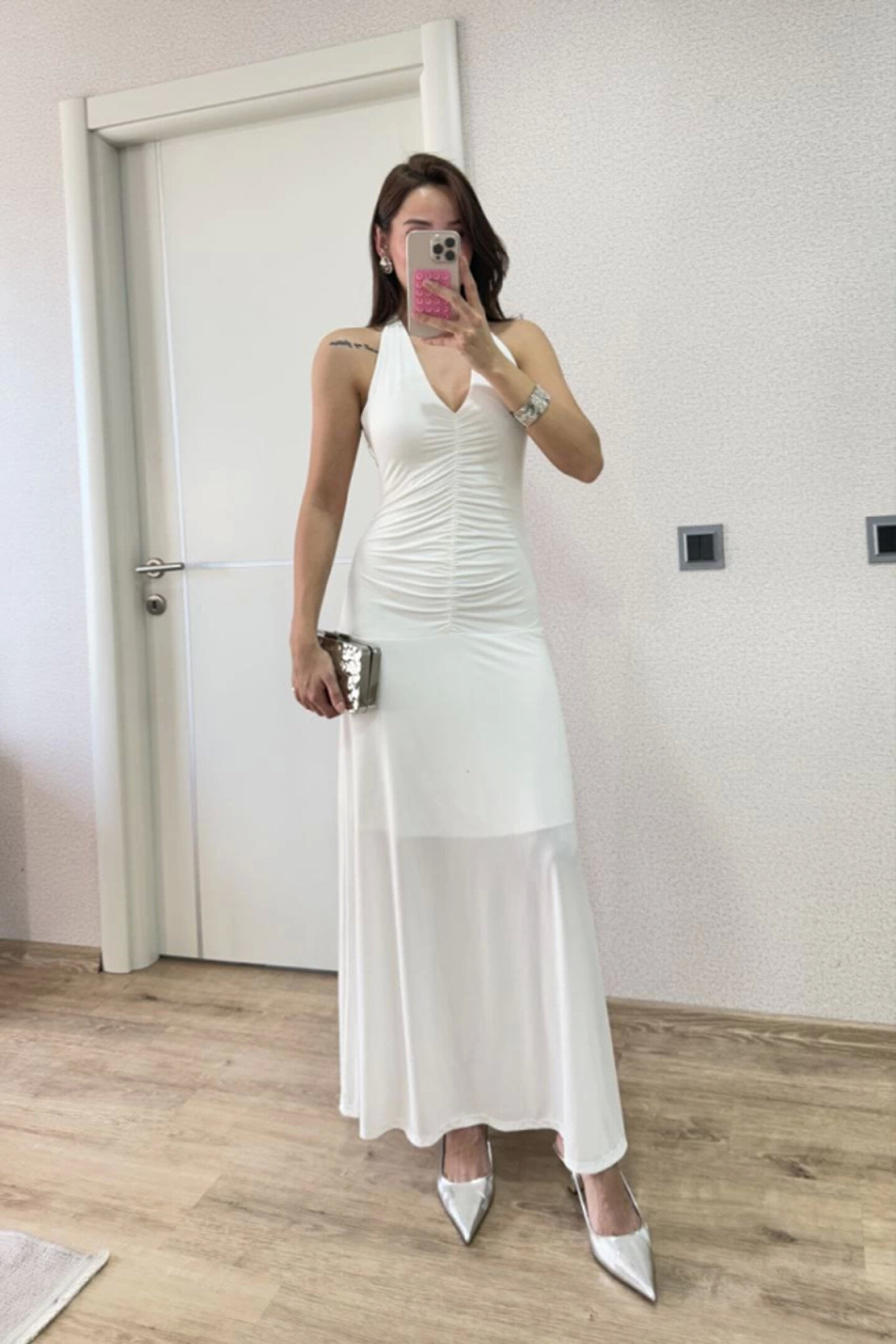 - Uzun ve şık tasarımıyla dikkat çeken bu beyaz elbise, hem günlük kullanım hem de özel günlerde tercih edilebilir.; - TR menşeli olup, kaliteli işçiliğiyle öne çıkar.; - Regular kalıp sayesinde rahat bir kullanım sunar ve vücut hatlarınıza uyum sağlar.; - Yetişkin yaş grubuna hitap eden bu elbise, her yaş grubundan kadının gardırobunda yerini alabilir.; - Polyester kumaş yapısı sayesinde uzun ömürlü kullanım ve kolay bakım imkanı sunar.; - L beden seçeneğiyle geniş beden yelpazesine sahip olup, farklı vücut tiplerine uyum sağlar.; - Kadın ve kızlar için tasarlanmış olup, feminen çizgileriyle göz alıcı bir görünüm kazandırır.; - Beyaz rengiyle her ortamda ferahlık ve zarafet katar; kombin yapmayı kolaylaştırır.; - Düz deseniyle sadelikten yana olanların tercihi olup, minimal şıklığı ön plana çıkarır.; - Kolsuz tasarımı ile yaz aylarında serinlik sağlar ve rahat hareket etme özgürlüğü tanır.; - Halter yaka tipi ile modern ve sofistike bir görünüm elde edilirken omuzları zarifçe sergiler.; - Yıkama talimatına uygun şekilde bakım yapıldığında uzun süreli kullanım için idealdir.; Homewear olarak da değerlendirilebilecek bu elbise, evde konforlu şıklık arayanlar için idealdir.