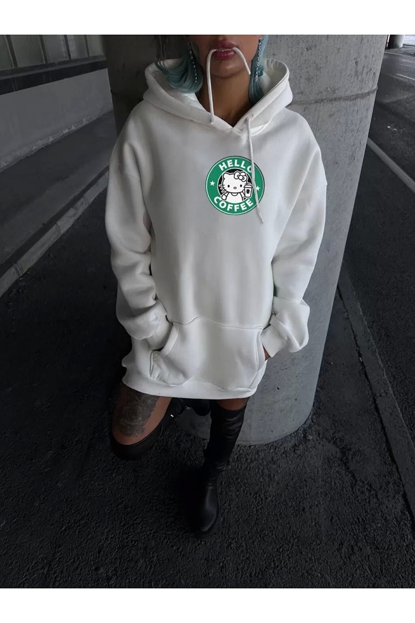 ruum fashions Üç İplik Penye Uzun Kol Kapüşonlu SweatShirt - Beyaz