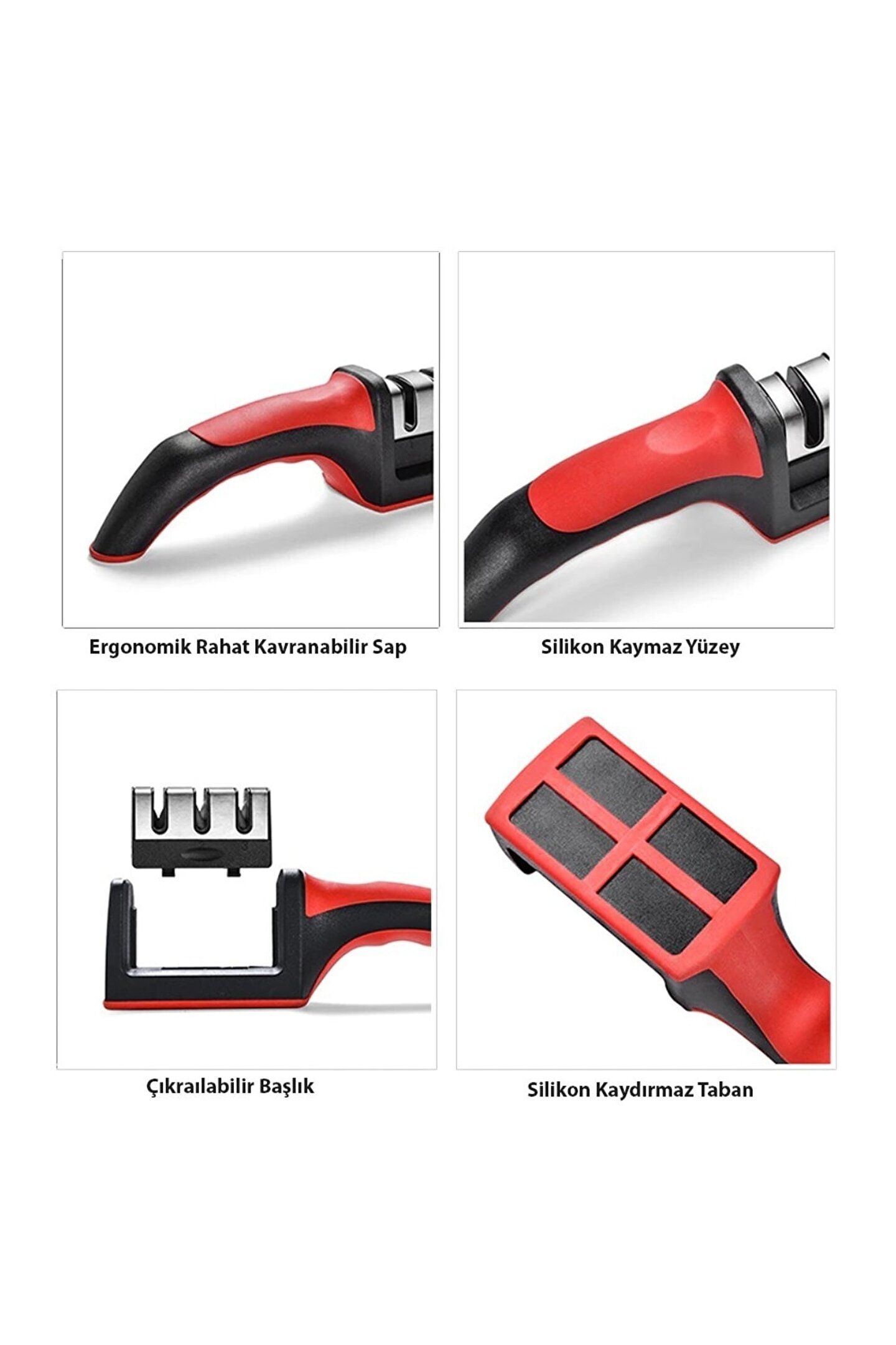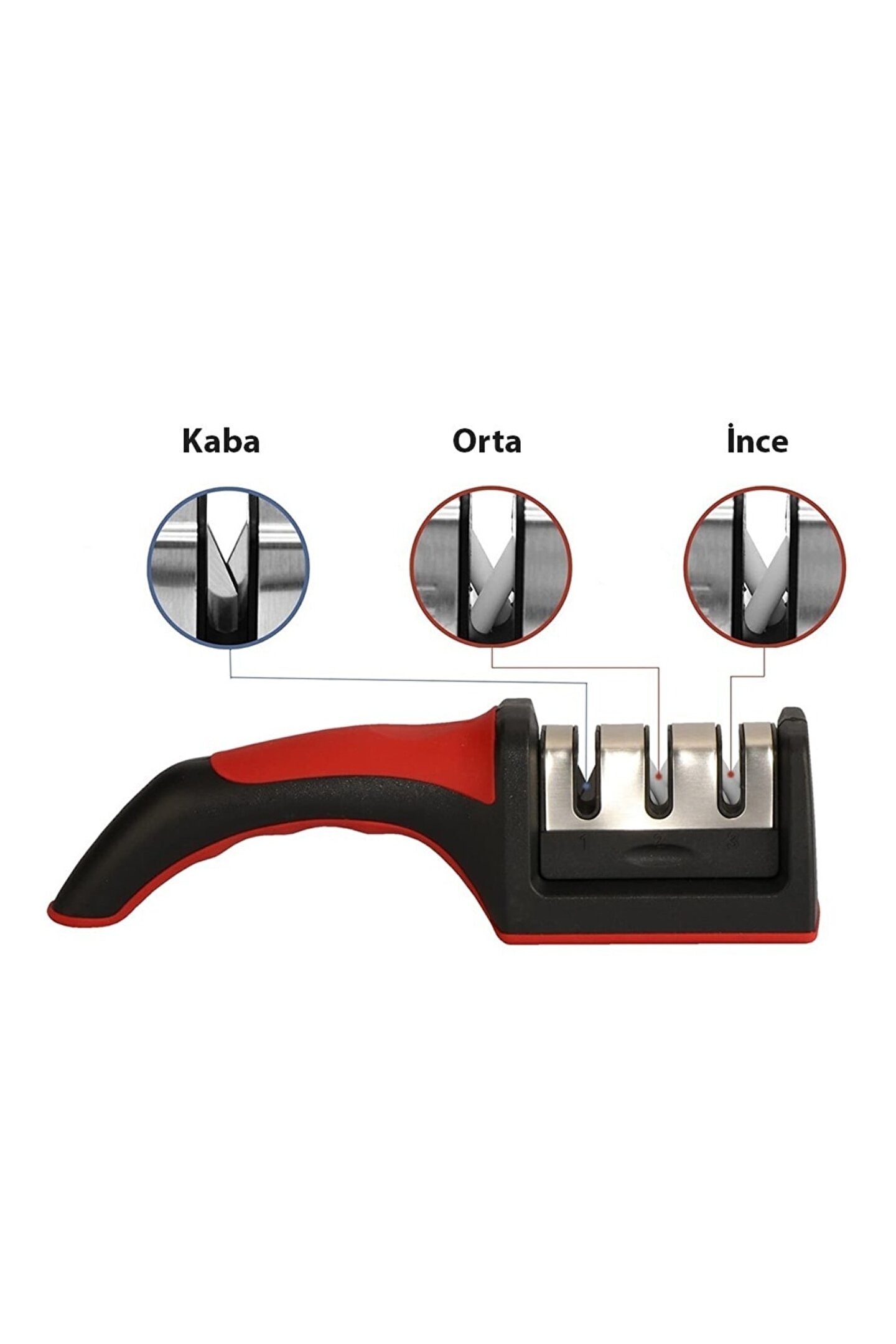 Şef saplı bıçak bileyici, ev tipi bileme aparatı Güvenliği sağlamak için kaydırmaz silikon taban ile silikon yüzey kaymaz sap yapısına sahiptir. ; Bu sayede hem kaba hem de ince bileme keskinleştirme işlemlerinizi yapmak çok kolay. ; 3 bileme bölümü sayesinde ağzı bozulmuş bıçaklarınızı düzeltebilir, keskinlik oranını ayarlayabilirsiniz. ; Ürünün boyutu uzunluk 21 cm x yükseklik 5,7 cm x genişlik 5 cm paket içeriği1 adet - Bıçak bileyici;