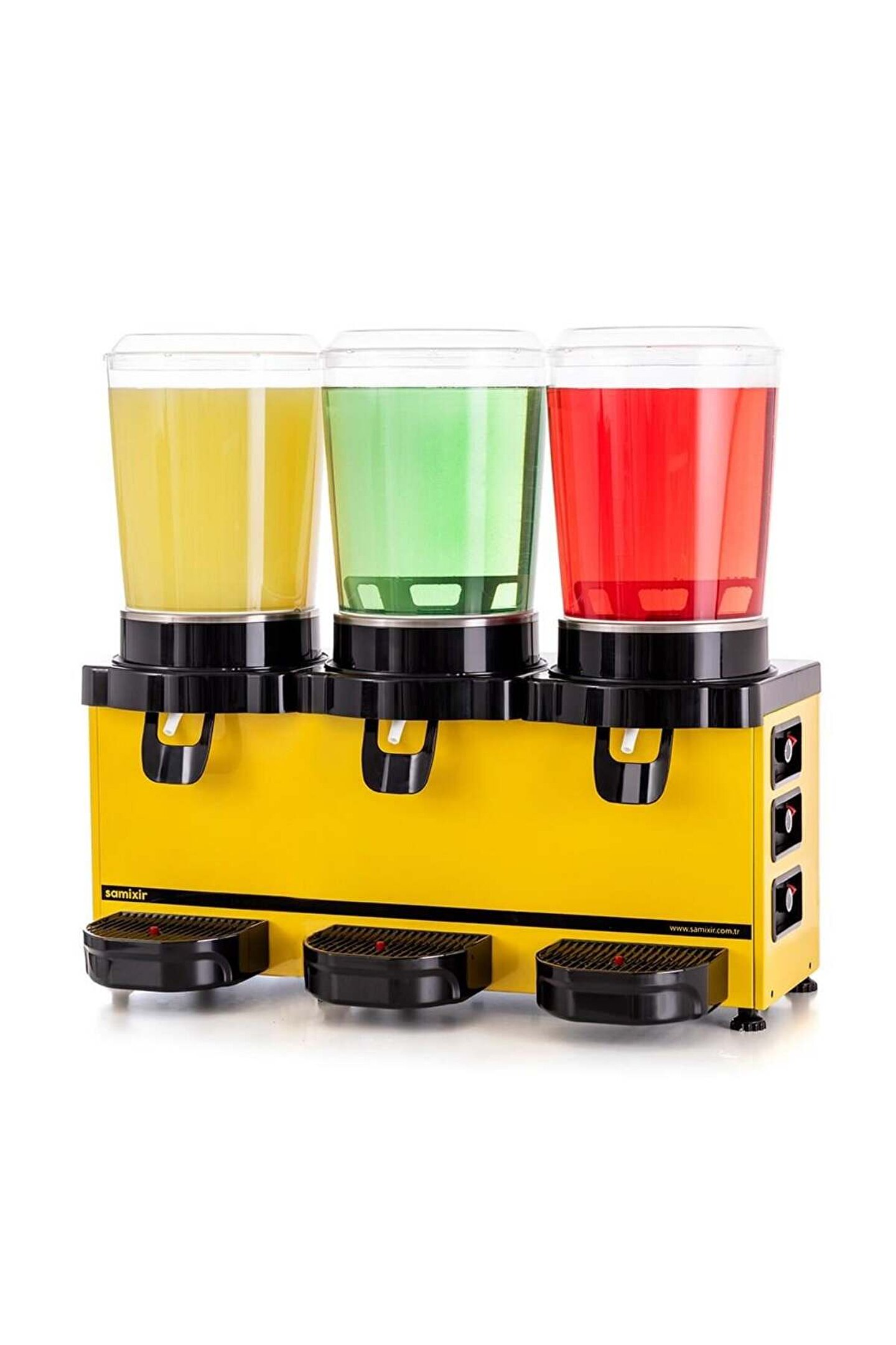 Samixir Triple Panoramik Analog 30 Lt Soğutuculu İçecek Makinesi - Sarı 2 Yıl üretici garantili.; CE Belgeli üretim.; Geniş soğutma tabanı sayesinde içecekler daha hızlı ve son damlasına kadar eşit olarak soğur.; Bu sayede klasik ürünlere göre %50’ye varan enerji tasarrufu sağlar.; Hazneler soğutma ve karıştırma konularında birbirlerinden bağımsız kontrol edilebilir, çoklu hazne sayesinde her an içecek temini sağlanabilir.; Pratik musluk sistemi; tek el kullanılarak rahatça içecek alabilmeyi sağlar.; Geniş musluk hortumu parçacıklı içeceklerde bile hızlı dolum sağlar ve kolaylıkla sökülüp temizlenebilir.; Manyetik palet sistemi sayesinde hazne içinde bulunan içeceğin alt motor bölümüne sızma riski ortadan kalkar, bu sayede motorun ömrü uzar.; Burgulu palet sistemi homojen bir karışım ve içeceğin daha hızlı soğumasını sağlar.; Mükemmel temizlik ve hijyen için içecekle temas eden tüm parçalara kolayca ulaşılır ve hızlı bir şekilde temizlenebilir.; Polikarbonat hazne darbeye dayanıklı ve gıda kullanımına uygundur.; Tek gövde ve üçlü hazne sayesinde farklı ve çeşitli içecekleri aynı anda sunmak isteyen işletmelere uygundur.; Damlalıkta bulunan seviye göstergesi sayesinde atık suyun taşmadan önce boşaltılması gerektiği rahatlıkla fark edilir.; Teknik Özellikler Hazne Kapasitesi 10L + 10L + 10L Akım 1,53 A Soğutucu Gaz R134A / R290 Ağırlık ve Ölçüler Makine Koli Sıcaklık Aralığı +3 °C — +10 °C Ağırlık 29 kg 32,5 kg Enerji Tüketimi 5 kWh/24h Genişlik 750 mm 780 mm Güç 300 W Derinlik 390 mm* 355 mm Soğutma Gücü 750 W Yükseklik 700 mm 720 mm Besleme Voltajı 220-240 V 50 Hz * damlalık dahil Opsiyonel Voltaj 208-220 V 60 Hz Opsiyonel Voltaj 115 V 60 Hz