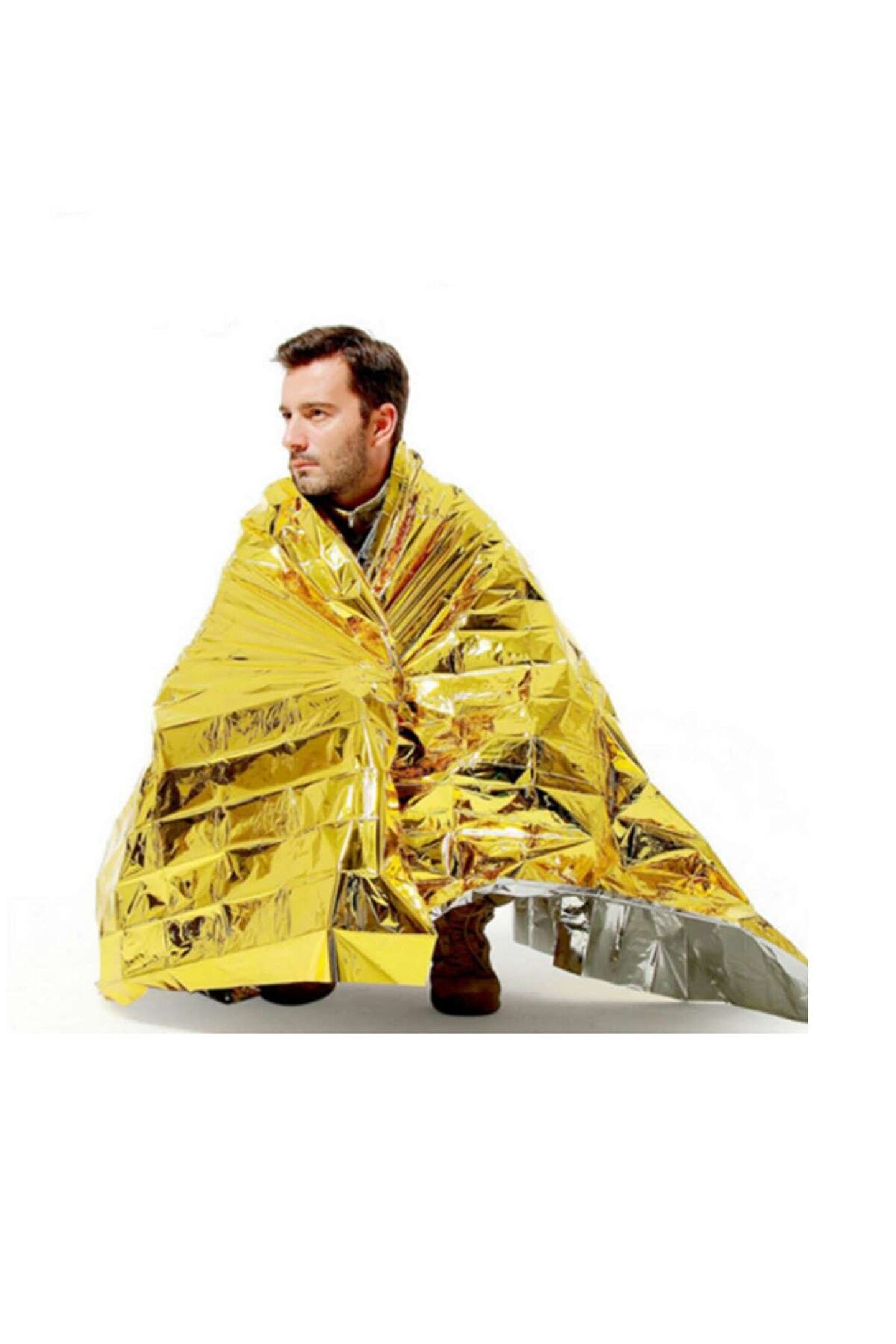 Acil Durum Ilk Yardım Battaniyesi Deprem Survival Termal Battaniye ; 160cmx210cm ; Termal battaniye nedir, ne için kullanılır? ; Acil durum ve afetlerde sıkça görülen, folyoyu andıran termal battaniyenin ilk yardım çantalarının içerisinde bulunması uzmanlar tarafından öneriliyor. ; Yaklaşık 70 yıldır kullanımda olan termal battaniye vücut ısısının korunmasını sağlıyor. Mylar adı verilen bir maddeden üretilen termal battaniye, hacmi düşük ve ısıyı koruma özelliği ile dikkat çekiyor. ; Son dönemde özellikle izmir depremindeki zarar gören mağdurlarda görülen battaniye merak konusu oldu. ; Termal battaniye nedir? ; 1950'lerde dupont tarafından icat edilmiş, daha sonra Nasa tarafından uzay görevlerinde kullanılmaya termal battaniye, içerdiği metal nedeni ile parlak bir görünüme sahiptir. Termal battaniye, sarılı olduğu kişiyi ısıtma görevi değil mevcut ısıyı muhafaza ederek yalıtım sağlama görevini gerçekleştiriyor. Vücuda sarıldığı andan itibaren dışarıdaki havanın içeri geçmesini önleyen battaniye aynı zamanda terleme etkisini de ortadan kaldırarak buharlaşmayla oluşabilecek ısı kayıplarını da en alt düzeye indirir. ; Termal battaniye iki yönlüdür ; Soğuk ve sıcağın yanı sıra su ve rüzgarı da geçirmeyen termal battaniye iki farklı yüzeyden oluşuyor. ; Bir yönü güneş koruması sayesinde serin tutmayı başarırken, diğer yönü ise ısıyı hapsederek vücudun sıcak kalmasını sağlar, böylece hipotermiyi engeller. ; ;