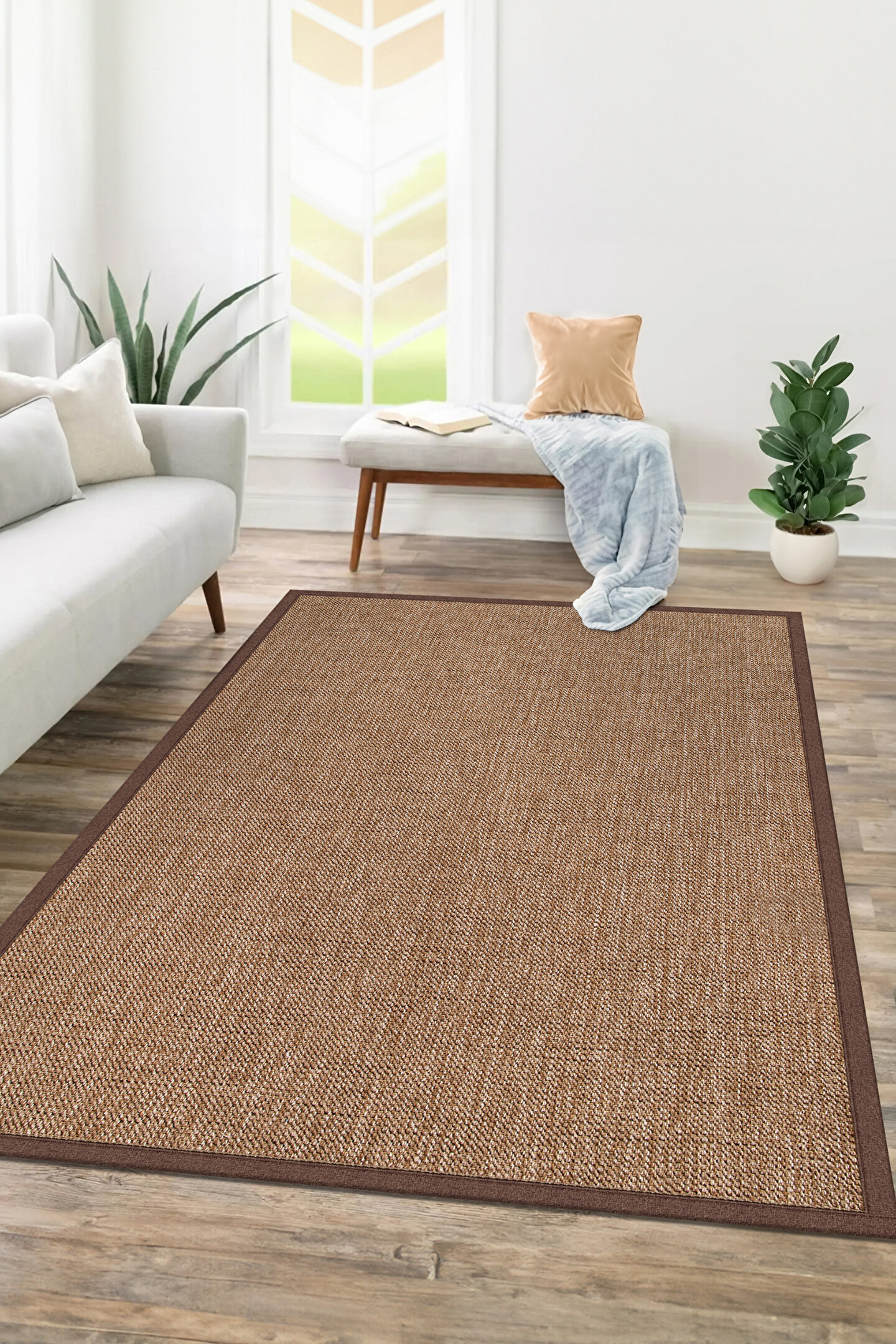 SARAZ HALI 0604-Kahve Kumaş Bordür Sisal Jut Halı Kilim Hav Toz Vermez Kolay Temizlenen Hasır Kilim