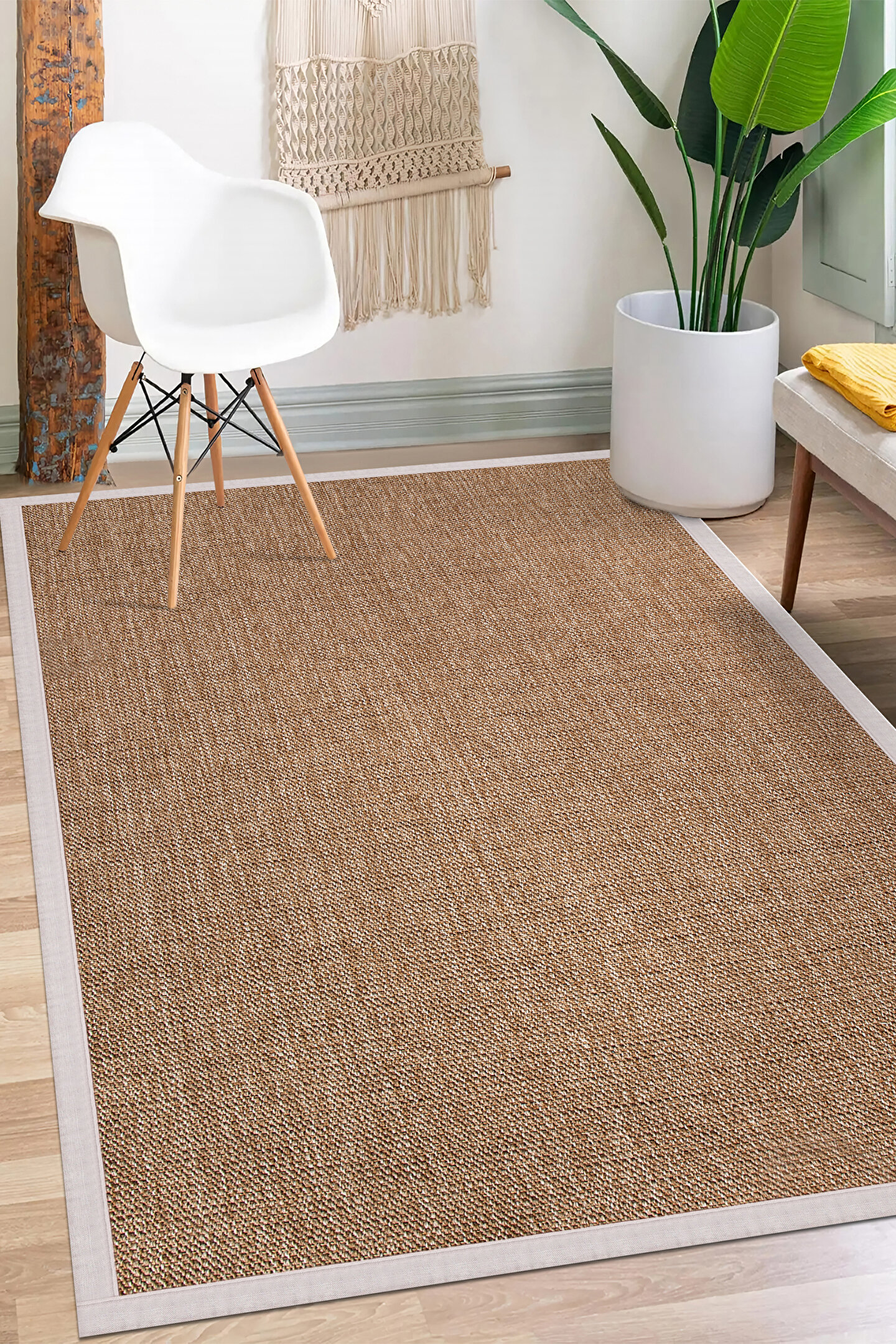 SARAZ HALI 0604-Krem Kumaş Bordür Sisal Jut Halı Kilim Hav Toz Vermez Kolay Temizlenen Hasır Kilim