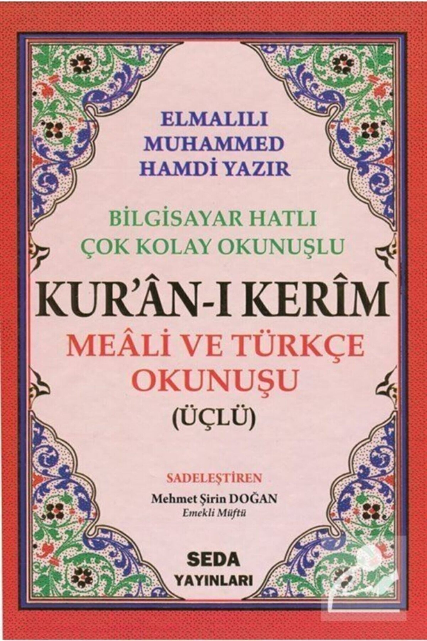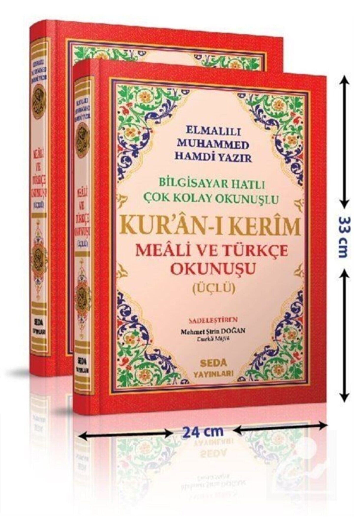 Kur'an-ı Kerim Arapça Türkçe Okunuşu ve Mealli Üçlü (Cami Boy, Kod: 002) Bilgisayar Hatlı, Çok Kolay Okunuşlu, Renkli Seda Yayınları Basım Yılı: 2020; Baskı: 4; Sayfa Sayısı: 624; Kağıt Türü: Şamuha Kağıt; Ebat: 24 x 33; Dil: Türkçe; Cilt Durumu: Karton Kapak; ISBN: 9944929141; Renk: Renkli; Çevirmen: Elmalılı Hamdi Yazır; Editör: Kadir Güneş; Sadeleştiren: Mehmet Şirin Doğan; Kuran-ı Kerimin Arapça metnini manasını ve Türkçe okunuşunu aynı anda bu eserde bulabilirsiniz. Eserin Arapça metni bilgisayar hattıyla yazılmış olup Çok Kolay Okunur Meal Kısmı Elmalılı Muhammed Hamdi Yazır Mealinden Sadeleştirlmiş Türkçe okunuşu Günümüz Türkçesinden Mealin Konu Fihristi Ayet Sırasına göre Surelerin Alfabetik Fihristi Mushaf Tertibine göre sureler Fihristi Nuzul Sırasına Göre Sureler Fihristi Hafız Osman Sıralaması 4 ayrı Fihrist oluşturulmuş ve eserin son sayfalarına Ali Haydar elifba eklenmiştir.