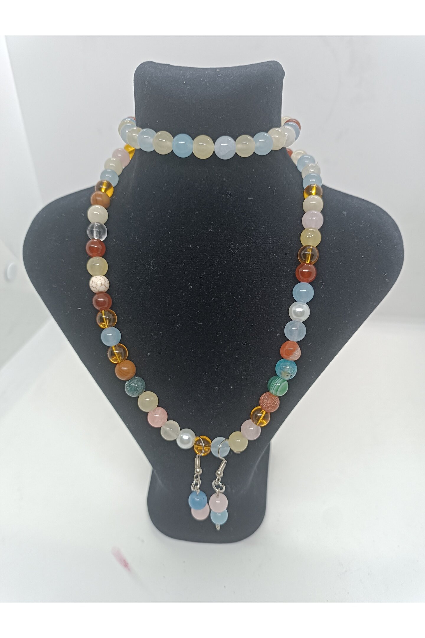 Dogal Taş Apatit Turkuaz Kristali Otantik Desenli Ahşap Boncuk Çelik Kolye