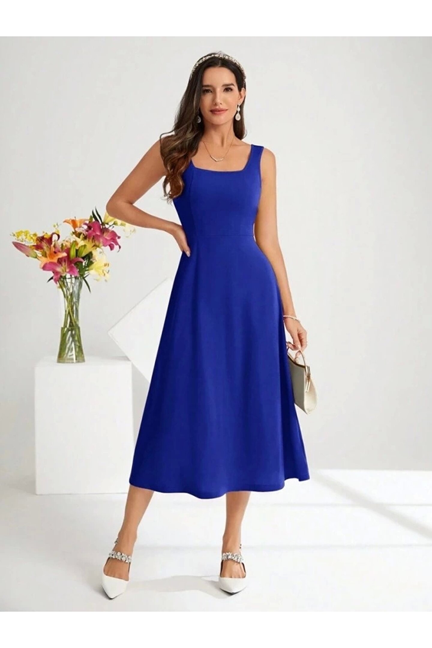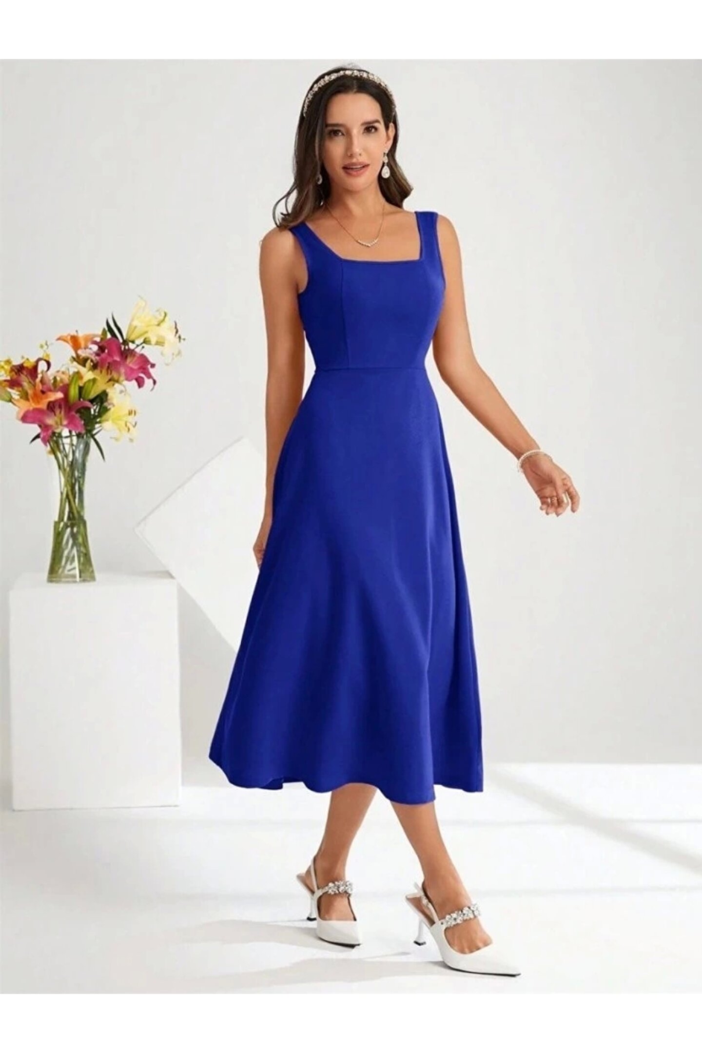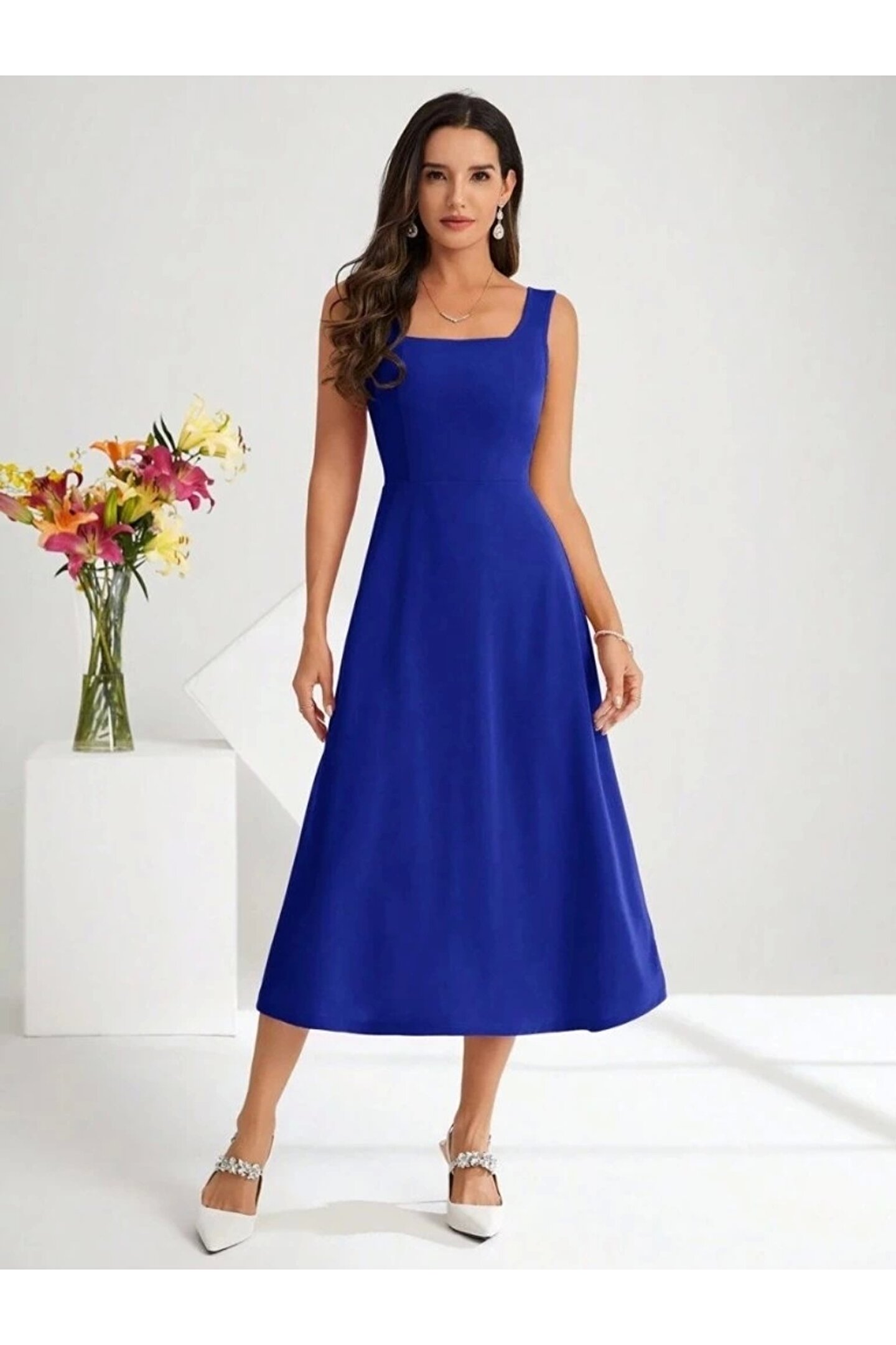 Sensuelle Boutique Kadın Askılı Kare Yakalı Midi Ithal Krep Elbise