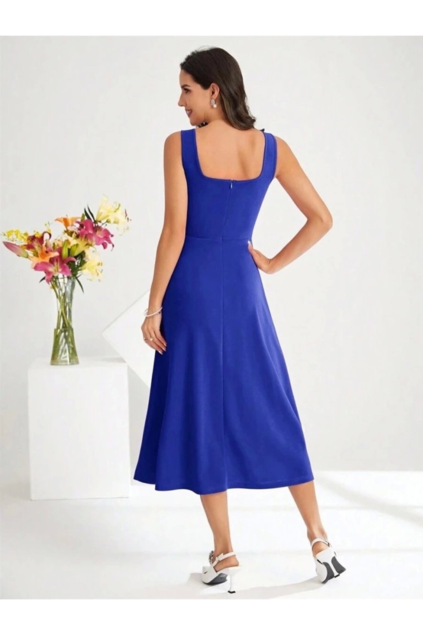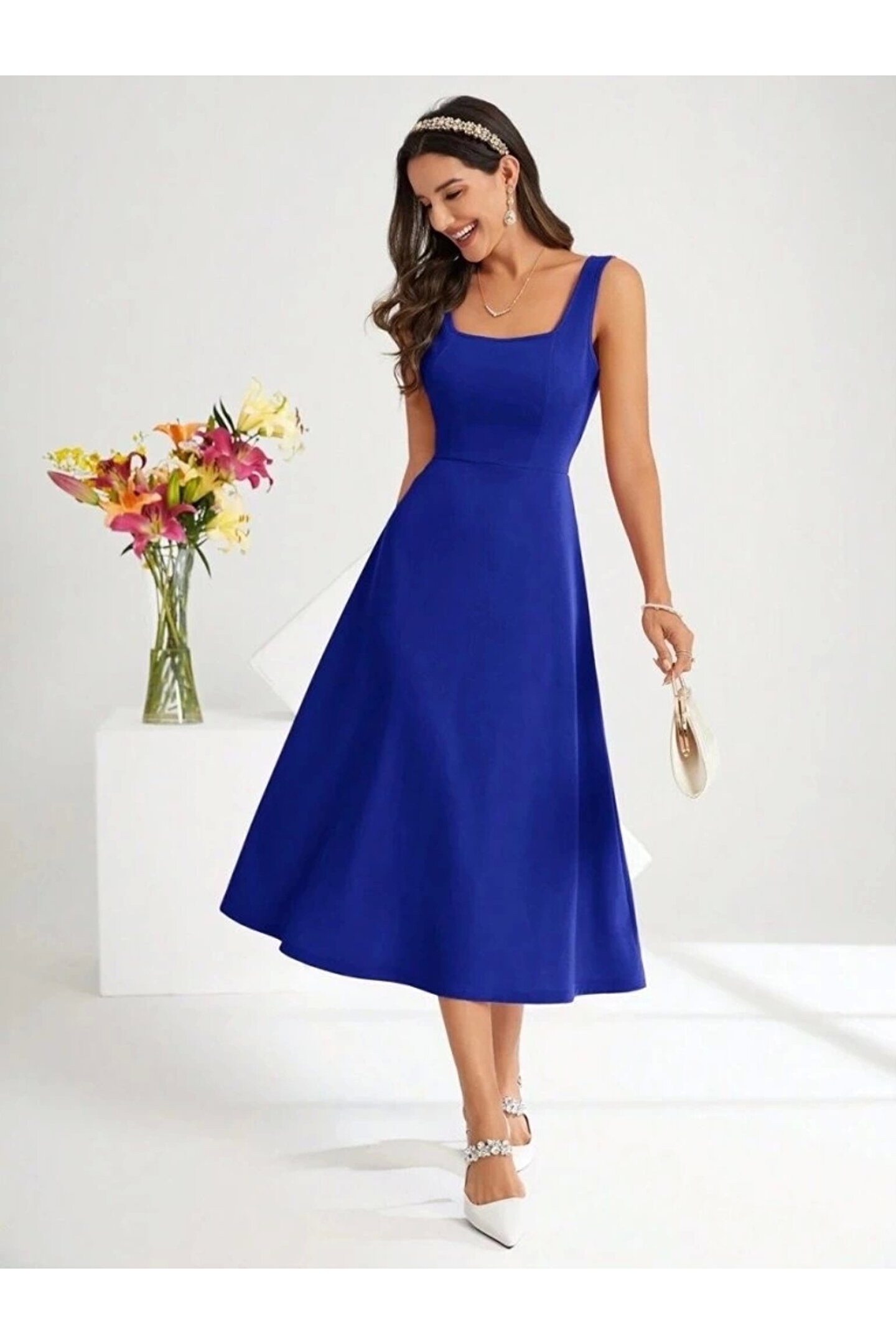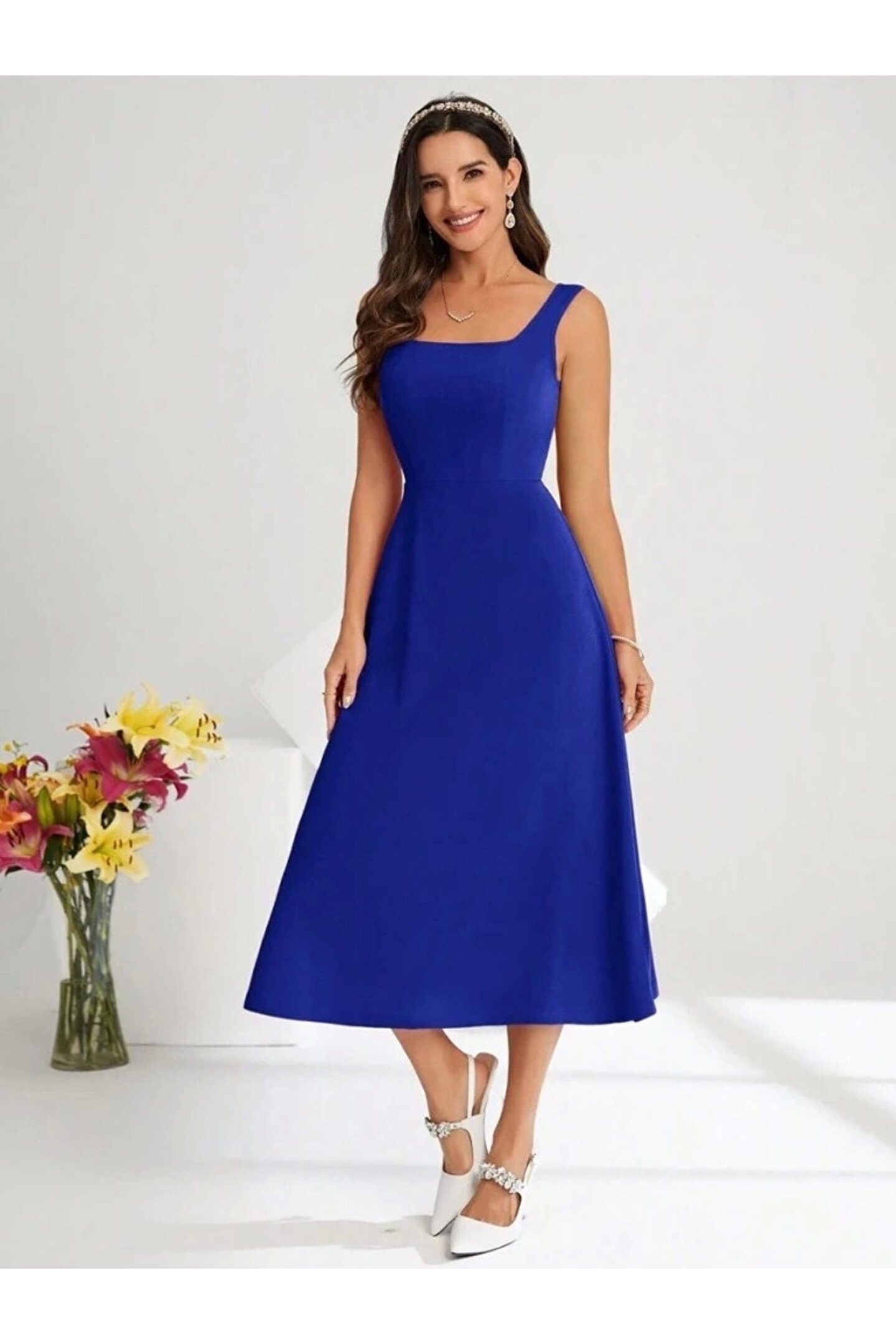 Sensuelle Boutique Kadın Askılı Kare Yakalı Midi Ithal Krep Elbise