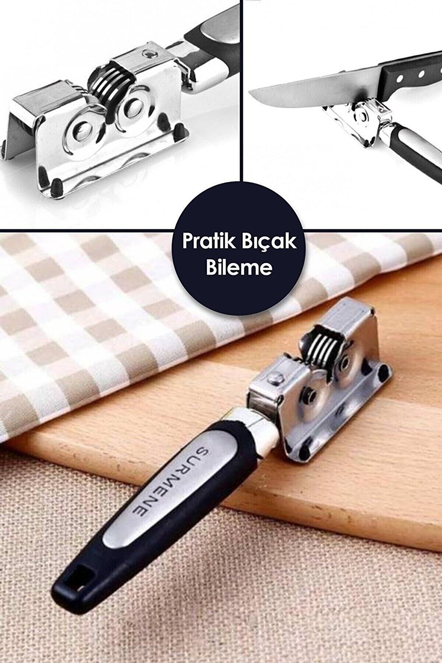 Paslanmaz çelik bıçak bileyici sayesinde artık mutfaklarınız da zorlanmayacaksınız.; ; Kör bıçakları yenilemek yerine pratik kolay bıçak bileyici ile yeni gibi yapabileceksiniz.; ; Paslanmaz çelik bıçak bileyici sayesinde artık mutfaklarınız da zorlanmayacaksınız.; ; Paslanmaz çelik keskinleştirme aparatı, çelik kaplama olup kullanımı pratiktir.; ; Bir bıçağı bileme zamanınız bir dakikanızı dahi almayacaktır.; ; Yapmanız gereken bıçağınızın sivri ucunu iki tekerlikle sistemin arasına yerleştirip ileri geri hareket ettirmek.; ; Özel sistemi sayesinde bıçağınızın keskinliğini daha da arttıracaksınız, farkı kullandığınız zaman göreceksiniz.; ; Kenar kısımlarındaki delik yerinden mutfağınızın duvarına da monte edebilir, kullanımı daha da kolay hale getirebilirsiniz.; ; Ürün ebatı 18,5 cm dir.