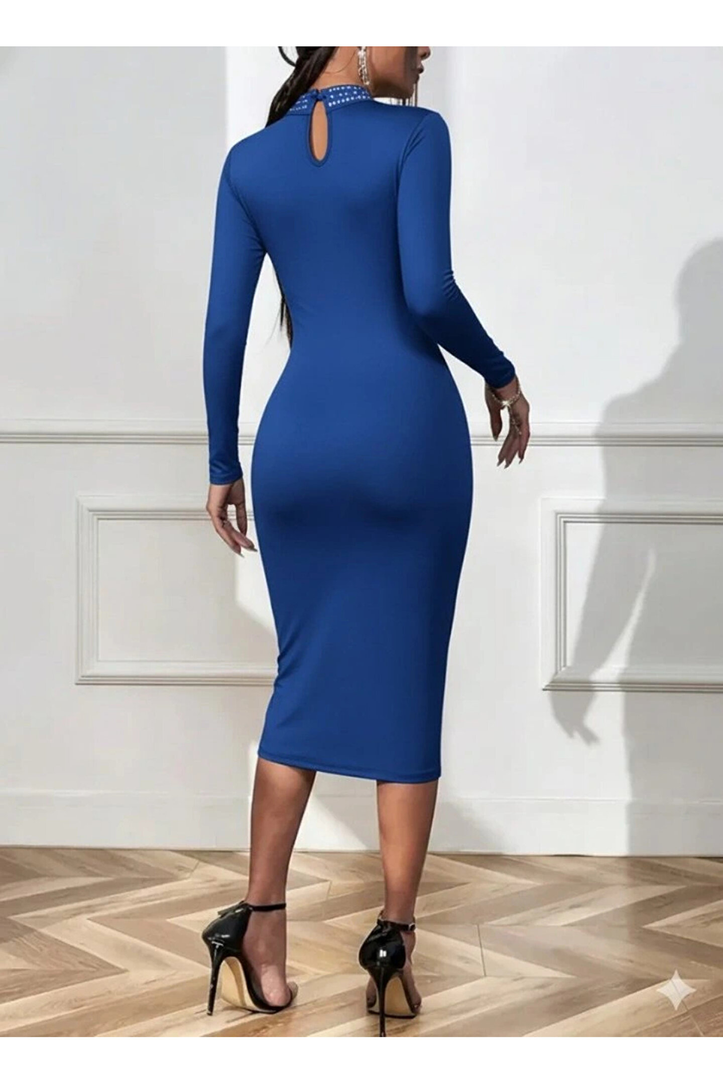 Kadın Uzun Kollu Balıkçı Yaka Taşlı Damla Detay Midi Ithal Krep Elbise