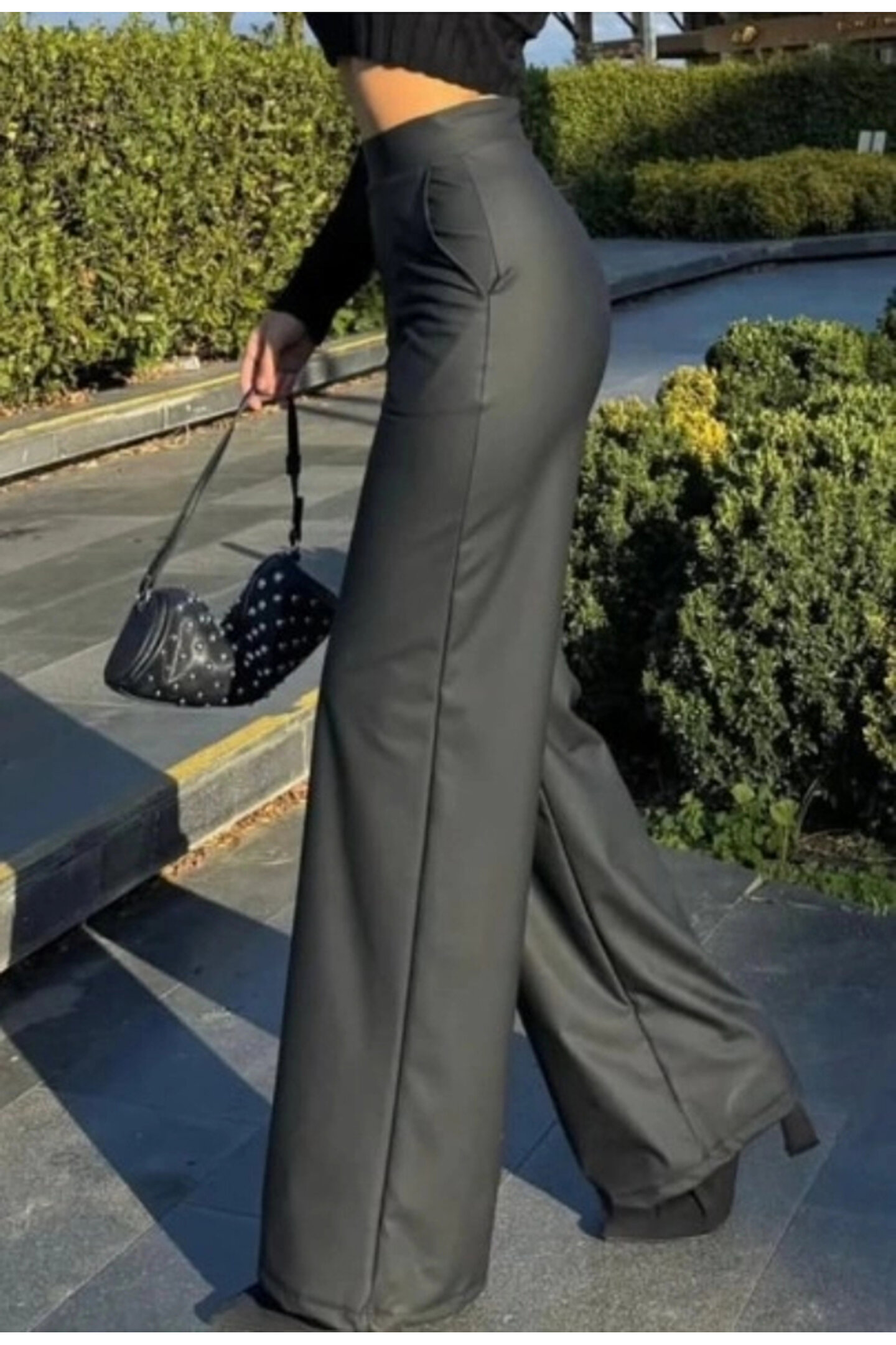Serero Kadın Yüksek Bel Cepli şardonlu Geniş Paçalı Mat Deri Pantolon