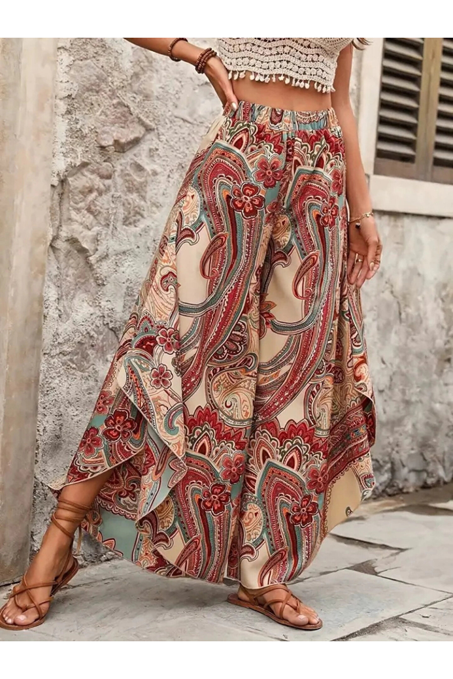 Kadın Yüksek Bel Beli Lastikli Desenli Geniş Paçalı Süprem Pantolon