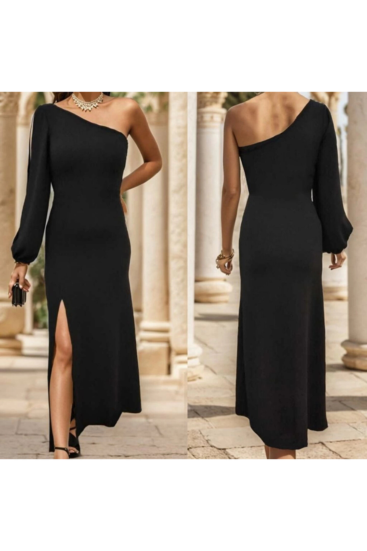 Serero Tek Omuz Açık Derin Yırtmaçlı Krep Tam Boy Elbise